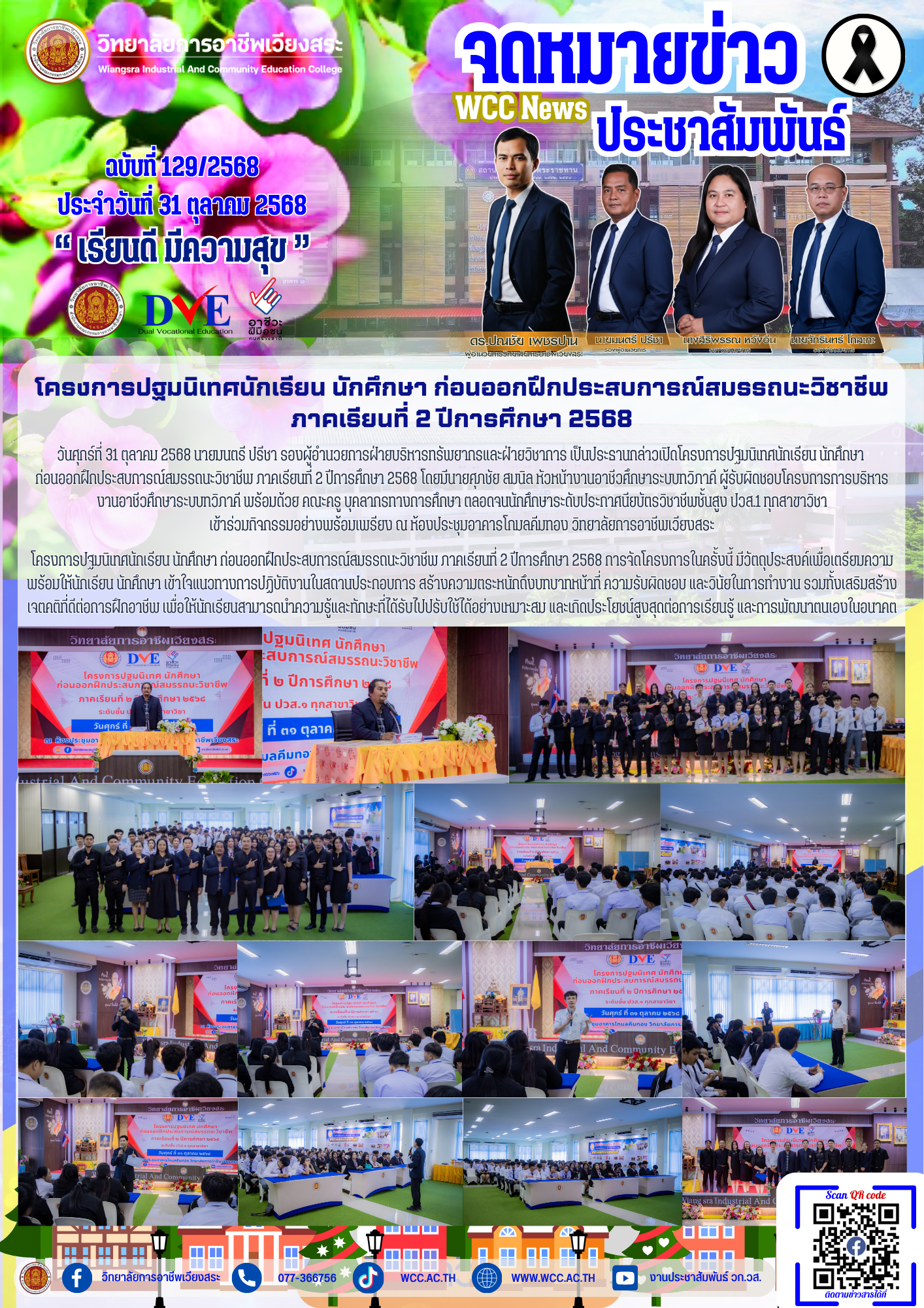 วันพุธที่ 20 สิงหาคม 2568 คณะผู้บริหาร ครู บุคลากรทางการศึกษา และนักเรียน นักศึกษา วิทยาลัยการอาชีพเวียงสระ ร่วมแสดงความยินดีกับตัวแทนนักเรียนนักศึกษา และครูที่ปรึกษา รับเกียรติบัตร ภายใต้โครงการสถานศึกษาสีขาวปลอดภัยยาเสพติด และอบายมุข (ห้องเรียนสีขาว) ประจำเดือนมิถุนายน 2568 โดยมีนายมนตรี ปรีชา รองผู้อำนวยการฝ่ายบริหารทรัพยากร/ฝ่ายวิชาการ นางสิริพรรณ หวังอีน รองผู้อำนวยการฝ่ายแผนงานและความร่วมมือ และนายจักรินทร์ โกละกะ รองผู้อำนวยการฝ่ายพัฒนากิจการนักเรียน นักศึกษา ให้เกียรติมอบเกียรติบัตรแก่ตัวแทนนักเรียนนักศึกษา และครูที่ปรึกษา ณ ลานกิจกรรมหน้าเสาธง วิทยาลัยกาอาชีพเวียงสระ