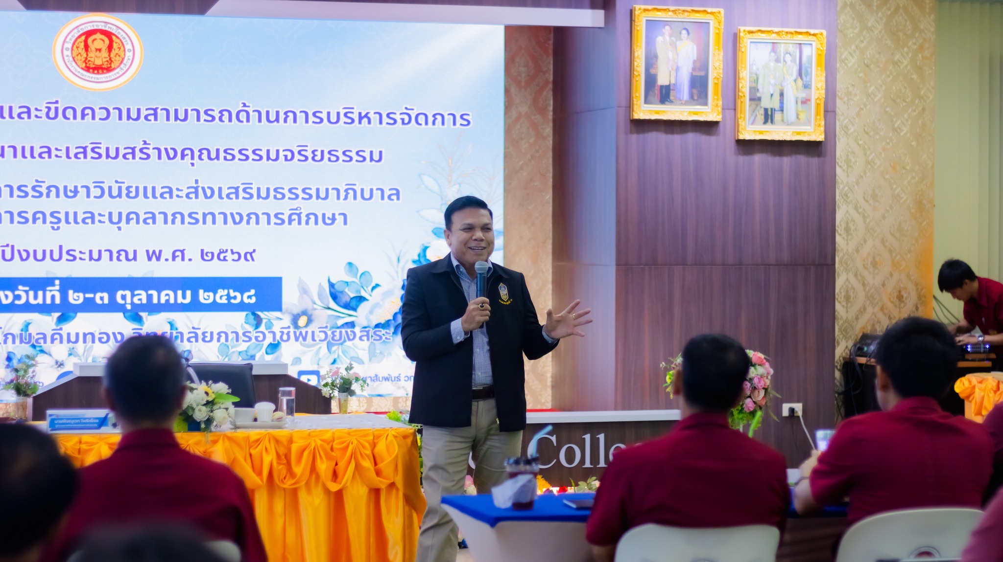 วันพฤหัสบดีที่ 2 ตุลาคม 2568 ผศ.ดร.ปณชัย เพชรปาน ผู้อำนวยการวิทยาลัยการอาชีพเวียงสระ กล่าวตอนรับนายพิษณุเวท โพธิ์เพ็ชร ผู้อำนวยการวิทยาลัยพณิชยการอินทราชัย ปฏิบัติหน้าที่ ผู้อำนวยการศูนย์บริหารการศึกษาพิเศษอาชีวศึกษา ซึ่งให้เกียรติเป็นวิทยากรบรรยายให้ความรู้ ภายใต้โครงการพัฒนาศักยภาพและขีดความสามารถด้านการบริหารจัดการ กิจกรรมที่ 3 พัฒนาและเสริมสร้างคุณธรรมจริยธรรม การอบรมครั้งนี้มุ่งเน้นแนวทางการรักษาวินัยและส่งเสริมธรรมาภิบาล สำหรับข้าราชการครูและบุคลากรทางการศึกษา ประจำปีงบประมาณ พ.ศ. 2569 จัดขึ้นระหว่างวันที่ 2–3 ตุลาคม 2568 ณ ห้องประชุมอาคารโกมลคีมทอง วิทยาลัยการอาชีพเวียงสระ