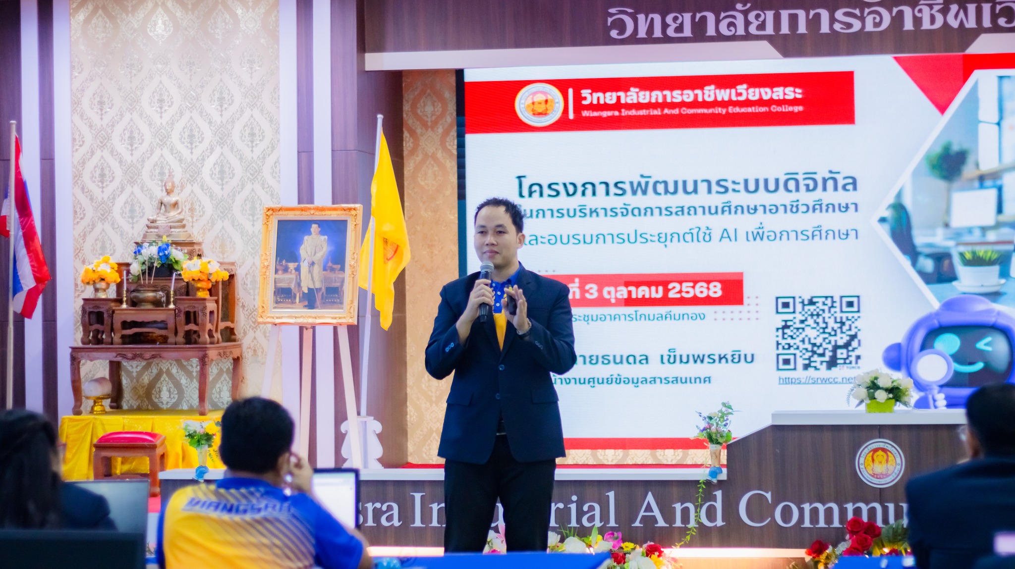 วันศุกร์ที่ 3 ตุลาคม 2568 ผศ.ดร.ปณชัย เพชรปาน ผู้อำนวยการวิทยาลัยการอาชีพเวียงสระ กล่าวเปิดโครงการพัฒนาศักยภาพและขีดความสามารถด้านการบริหารจัดการ สำหรับข้าราชการครูและบุคลากรทางการศึกษา ประจำปีงบประมาณ พ.ศ. 2569 ภายใต้โครงการพัฒนาระบบดิจิทัลในการบริหารจัดการสถานศึกษาอาชีวศึกษา และการอบรมการประยุกต์ใช้ Ai เพื่อการศึกษา โดยได้รับเกียรติจาก นายธนดล เข็มพรหยิบ หัวหน้างานศูนย์ข้อมูลสารสนเทศ เป็นวิทยากรบรรยาย ถ่ายทอดองค์ความรู้ ประสบการณ์ และแนวทางการประยุกต์ใช้ระบบดิจิทัลและเทคโนโลยีปัญญาประดิษฐ์ (Ai) ในการจัดการศึกษา เพื่อเสริมสร้างศักยภาพบุคลากรและยกระดับคุณภาพการเรียนการสอนของสถานศึกษาอาชีวศึกษา
