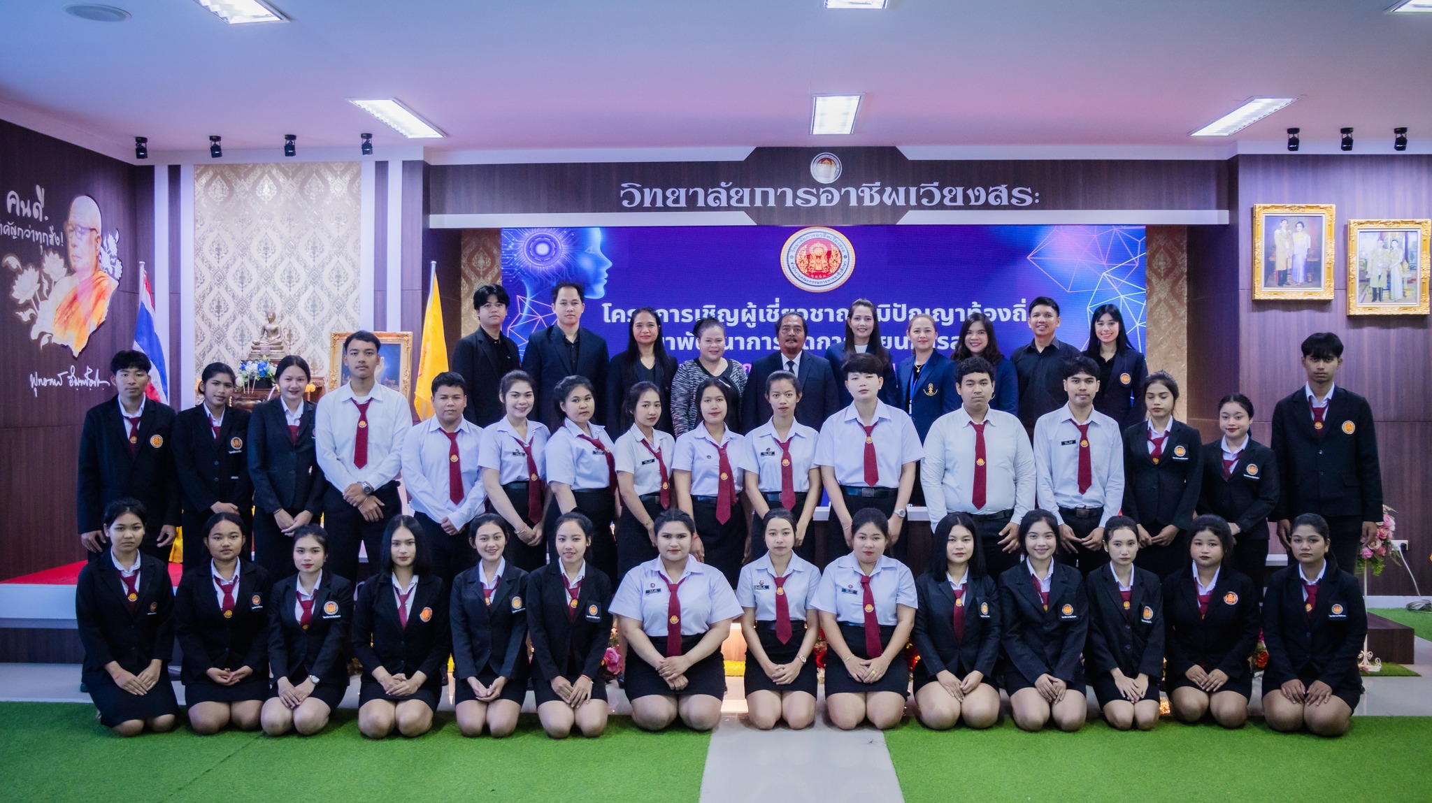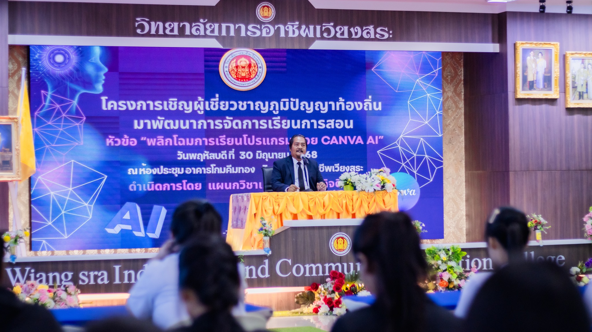 วันพฤหัสบดีที่ 30 ตุลาคม 2568 นายมนตรี ปรีชา รองผู้อำนวยการฝ่ายบริหารทรัพยากรและฝ่ายวิชาการ เป็นประธานกล่าวเปิดโครงการเชิญผู้เชี่ยวชาญภูมิปัญญาท้องถิ่นมาพัฒนาการจัดการเรียนการสอน หัวข้อ "พลิกโฉมการเรียนโปรแกรม ด้วย CANVA AI" โดยมีนายธนดล เข็มพรหยิบ ครูประจำสาขาวิชาเทคโนโลยีธุรกิจดิจิทัล กล่าวรายงานวัตถุประสงค์ ภายในกิจกรรมมีคณะครู บุคลากรทางการศึกษา และนักศึกษาระดับประกาศนียบัตรวิชาชีพชั้นสูง (ปวส.) แผนกวิชาคอมพิวเตอร์ธุรกิจ เข้าร่วมเรียนรู้และแลกเปลี่ยนประสบการณ์อย่างพร้อมเพรียง ณ ห้องประชุมอาคารโกมลคีมทอง วิทยาลัยการอาชีพเวียงสระ