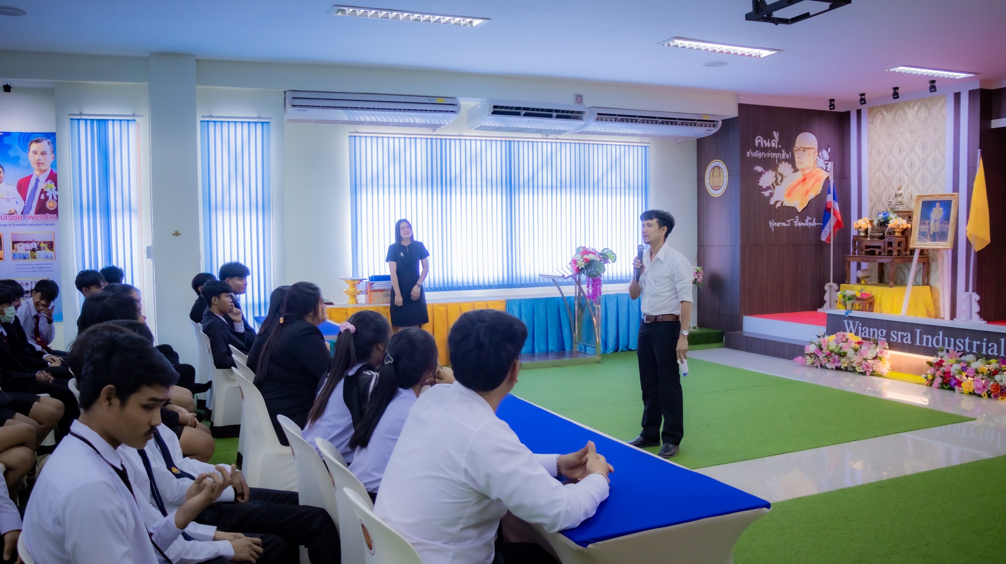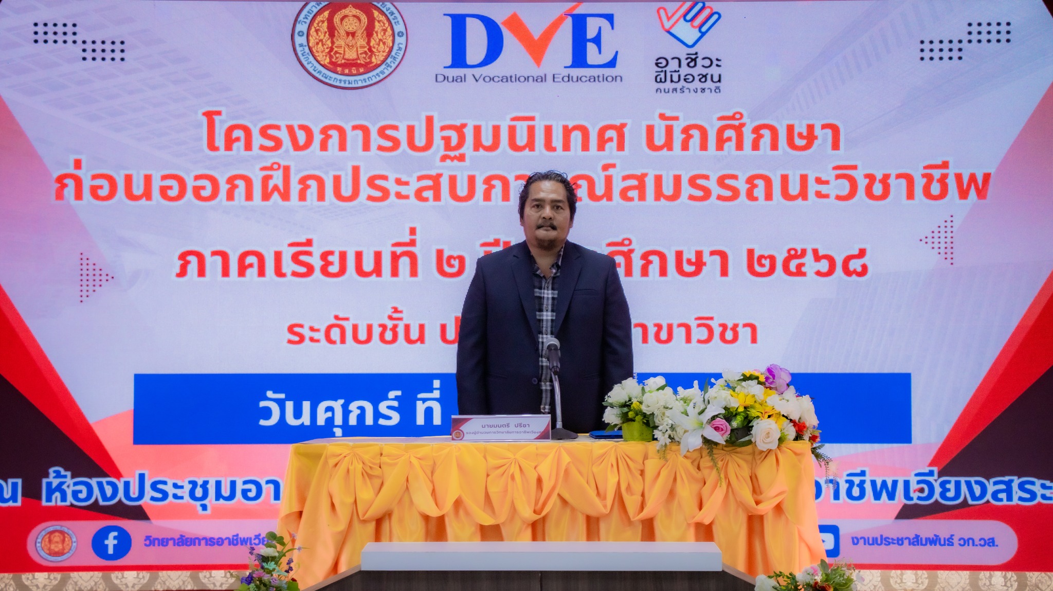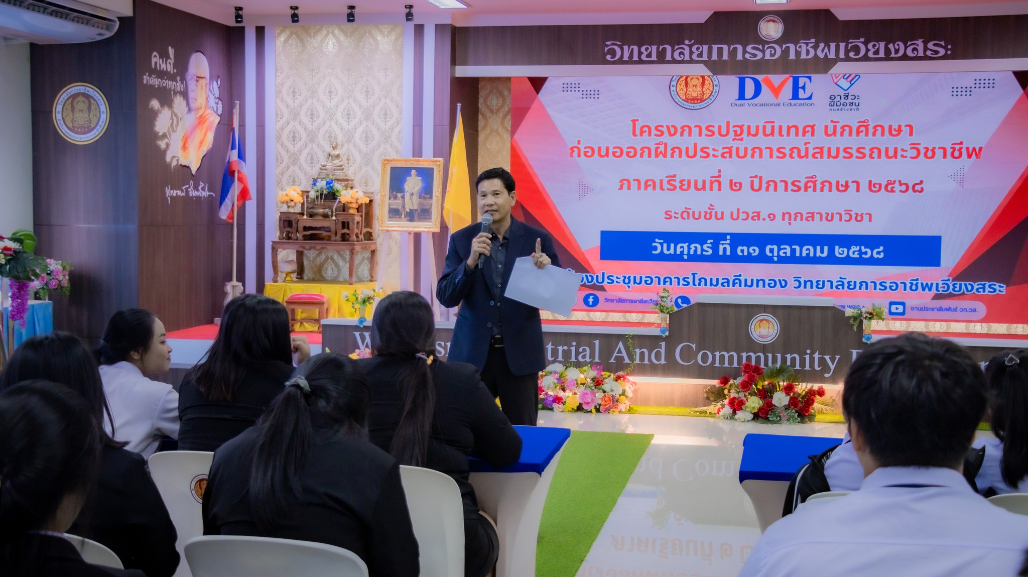 วันศุกร์ที่ 31 ตุลาคม 2568 นายมนตรี ปรีชา รองผู้อำนวยการฝ่ายบริหารทรัพยากรและฝ่ายวิชาการ เป็นประธานกล่าวเปิดโครงการปฐมนิเทศนักเรียน นักศึกษา ก่อนออกฝึกประสบการณ์สมรรถนะวิชาชีพ ภาคเรียนที่ 2 ปีการศึกษา 2568 โดยมีนายศุภชัย สมนิล หัวหน้างานอาชีวศึกษาระบบทวิภาคี ผู้รับผิดชอบโครงการการบริหารงานอาชีวศึกษาระบบทวิภาคี พร้อมด้วย คณะครู บุคลากรทางการศึกษา ตลอดจนนักศึกษาระดับประกาศนียบัตรวิชาชีพชั้นสูง ปวส.1 ทุกสาขาวิชา เข้าร่วมกิจกรรมอย่างพร้อมเพรียง ณ ห้องประชุมอาคารโกมลคีมทอง วิทยาลัยการอาชีพเวียงสระ