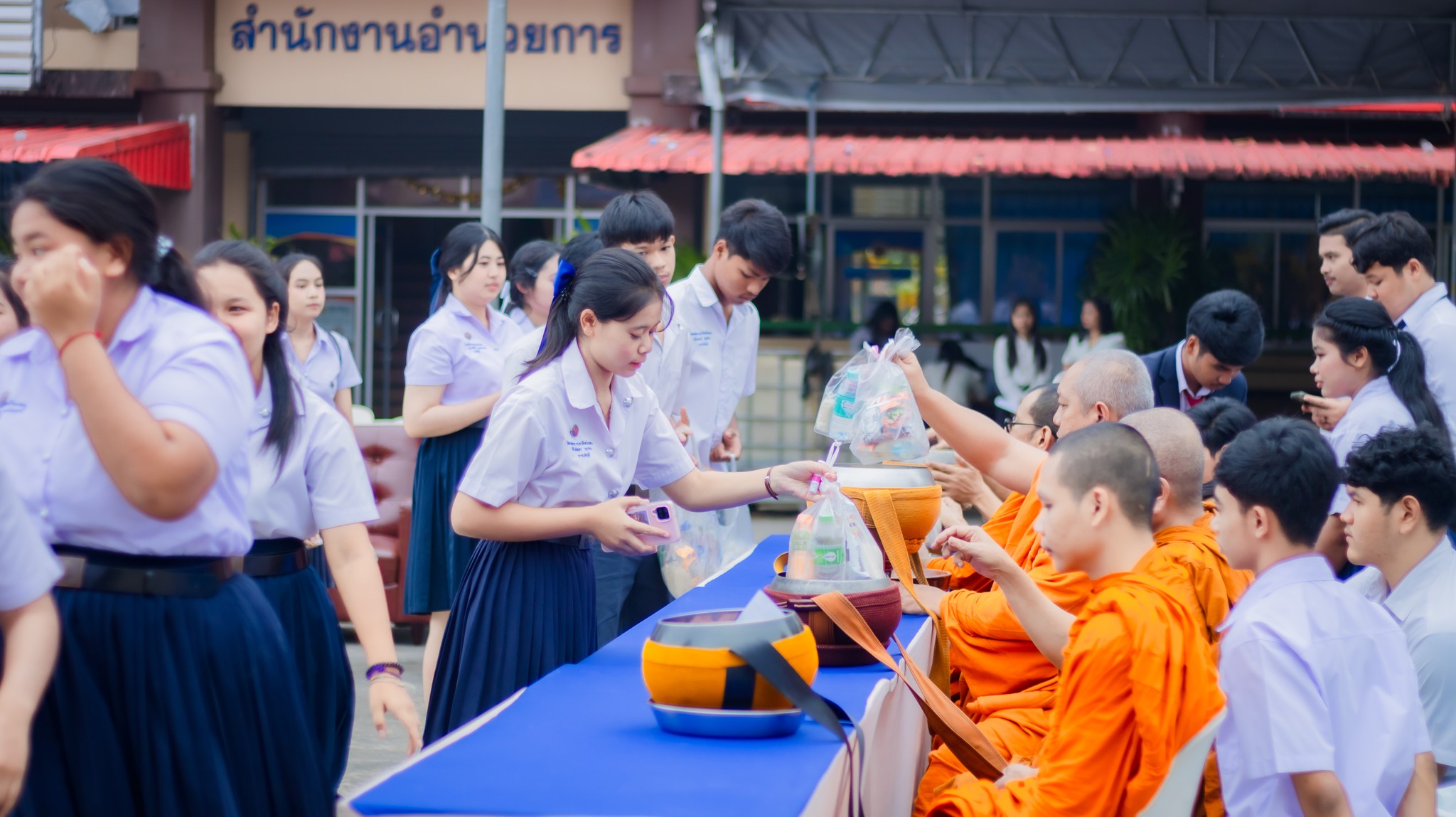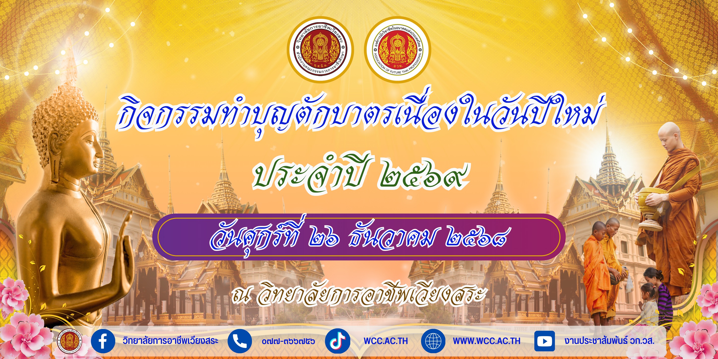 วันศุกร์ที่ 26 ธันวาคม 2568 ดร.ปณชัย เพชรปาน ผู้อำนวยการวิทยาลัยการอาชีพเวียงสระ และคณะผู้บริหาร ครู บุคลากรทางการศึกษา และนักเรียน นักศึกษา วิทยาลัยการอาชีพเวียงสระ ร่วมกิจกรรมทำบุญตักบาตรเนื่องในวันปีใหม่ ประจำปี 2569 และสืบสานประเพณีและวัฒนธรรมอันดีงามของไทย เสริมสร้างความเป็นสิริมงคล ความสามัคคี และปลูกฝังคุณธรรมจริยธรรมให้แก่ผู้บริหาร ครู บุคลากรทางการศึกษา ตลอดจนนักเรียน นักศึกษา เนื่องในโอกาสวันขึ้นปีใหม่ ประจำปี 2569 ณ ลานกิจกรรมหน้าเสาธง วิทยาลัยการอาชีพเวียงสระ
