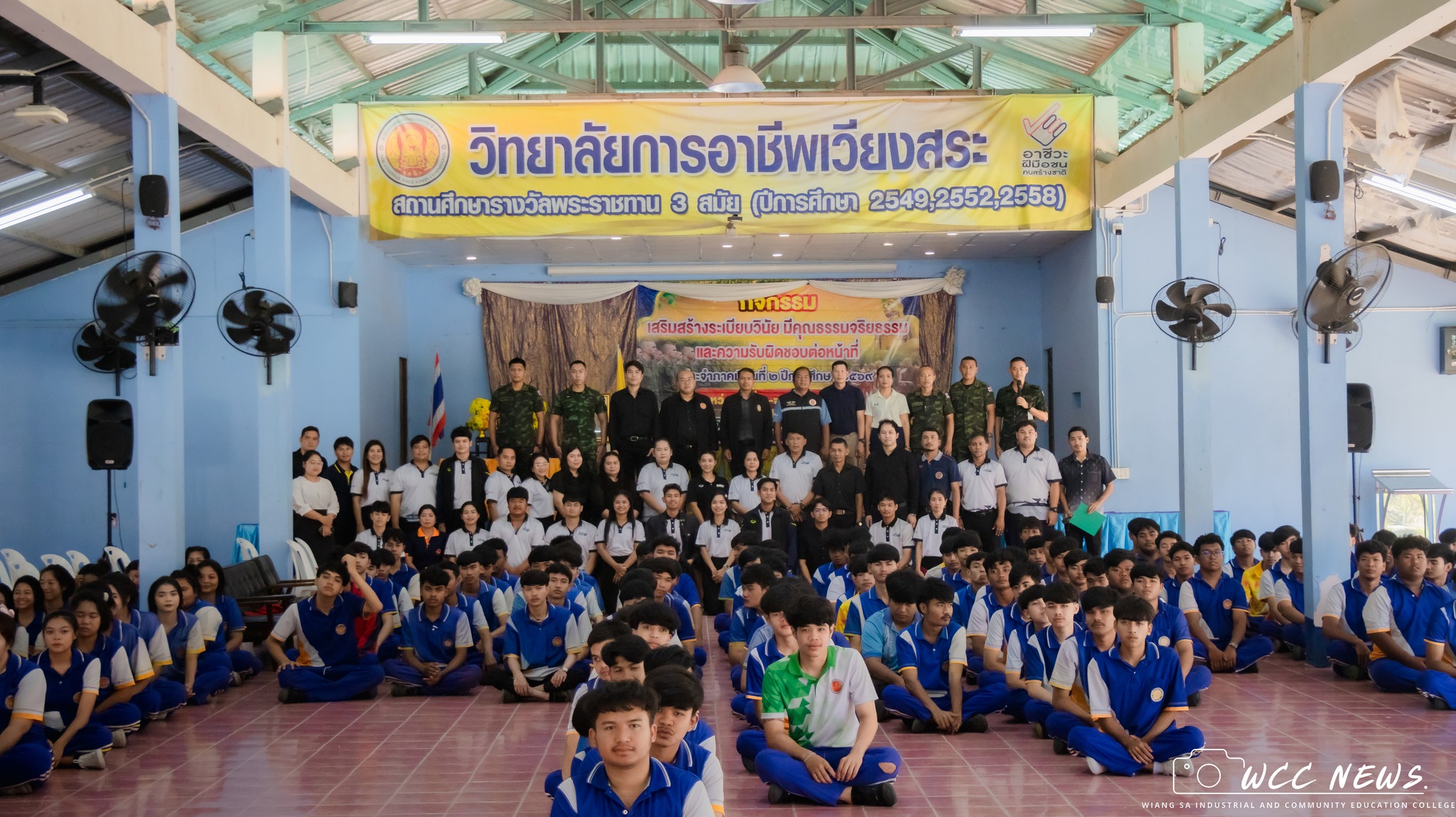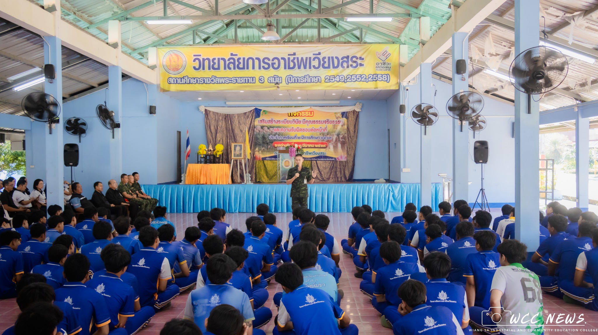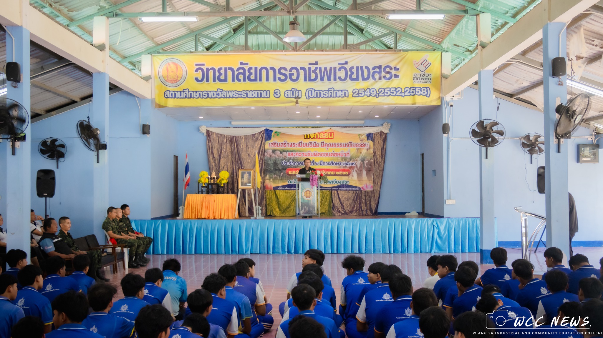 วันพุธ ที่ 4 มีนาคม 2569 ดร.ปณชัย เพชรปาน ผู้อำนวยการวิทยาลัยการอาชีพเวียงสระ เป็นประธานกล่าวเปิด กิจกรรมเสริมสร้างระเบียบวินัย มีคุณธรรมจริยธรรม และความรับผิดชอบต่อหน้าที่ ภาคเรียนที่ 2 ประจำปีการศึกษา 2568 โดยมี นายจักรินทร์ โกละกะ รองผู้อำนวยการฝ่ายพัฒนากิจการนักเรียน นักศึกษา กล่าวรายงานฯ พร้อมด้วย ครู บุคลากรทางการศึกษา ตลอดจนนักเรียนระดับประกาศนียบัตรวิชาชีพ ปวช. และนักศึกษาระดับประกาศนียบัตรวิชาชีพชั้นสูง ปวส. เข้าร่วมกิจกรรมอย่างพร้อมเพรียง ณ วิทยาลัยการอาชีพเวียงสระ