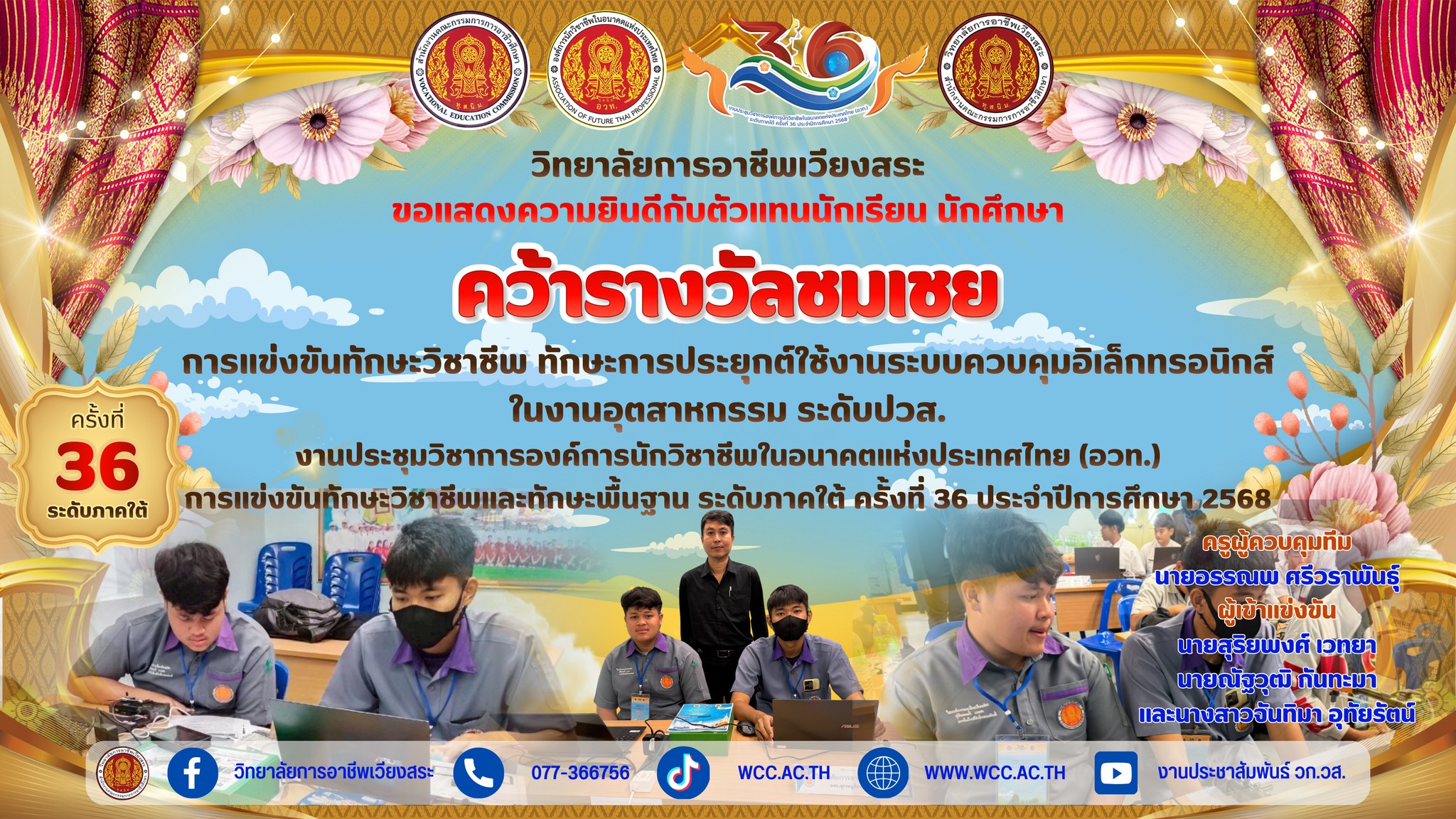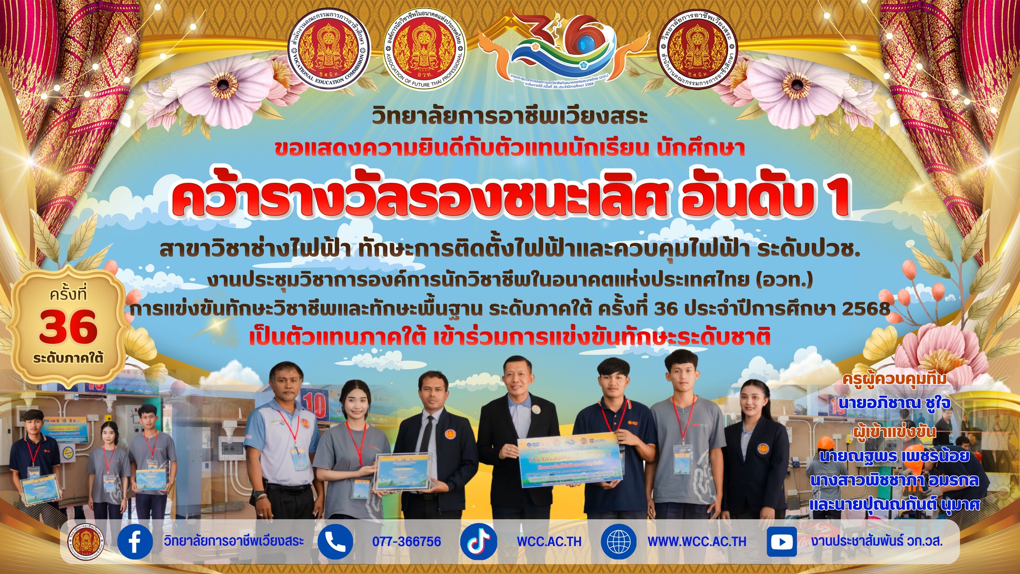 คว้ารางวัลรองชนะเลิศ อันดับ 1 ทักษะการติดตั้งไฟฟ้าและควบคุมไฟฟ้า ระดับปวช. ระดับภาคใต้ ครั้งที่ 36