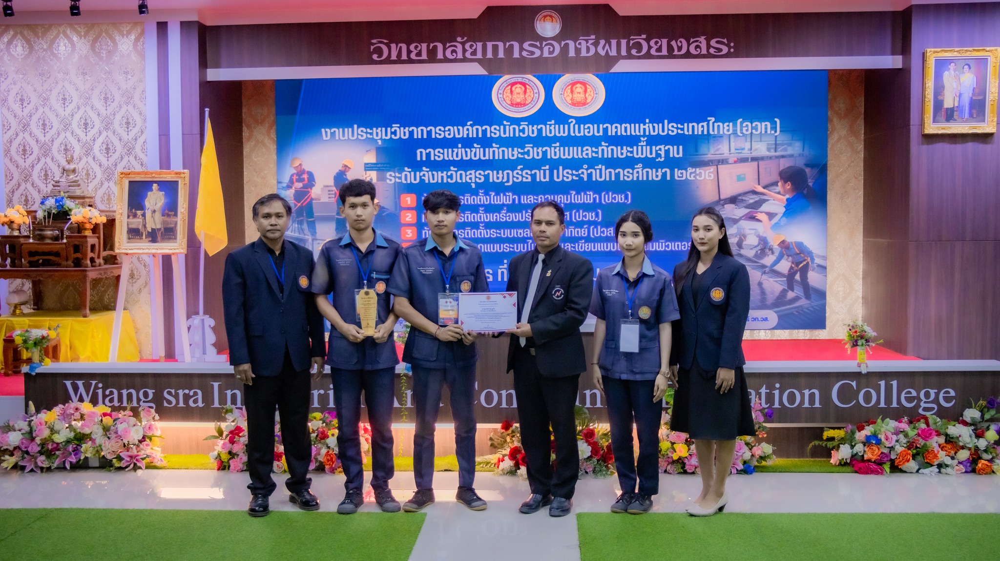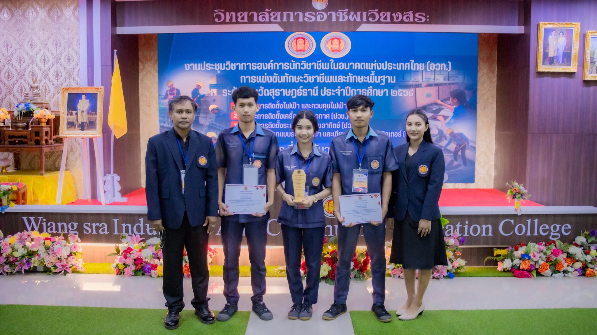 มาแล้ว! รางวัลที่ 1 วิทยาลัยการอาชีพเวียงสระ ขอแสดงความยินดีกับตัวแทนนักเรียน นักศึกษา ที่ได้รับรางวัล ชนะเลิศ การแข่งขันทักษะวิชาชีพ สาขาวิชาช่างไฟฟ้า ทักษะการติดตั้งไฟฟ้าและควบคุมไฟฟ้า (ระดับ ปวช.)
