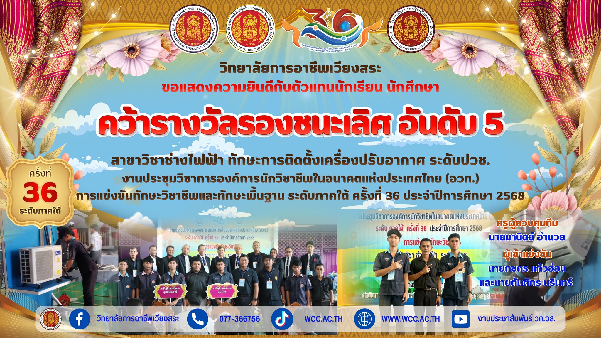 วิทยาลัยการอาชีพเวียงสระ ขอชื่นชมในความมุ่งมั่น ตั้งใจ และความสามารถอันยอดเยี่ยมของนักศึกษาและครูผู้ควบคุมทีม ที่นำชื่อเสียงและความภาคภูมิใจมาสู่วิทยาลัย และจังหวัดสุราษฎร์ธานี