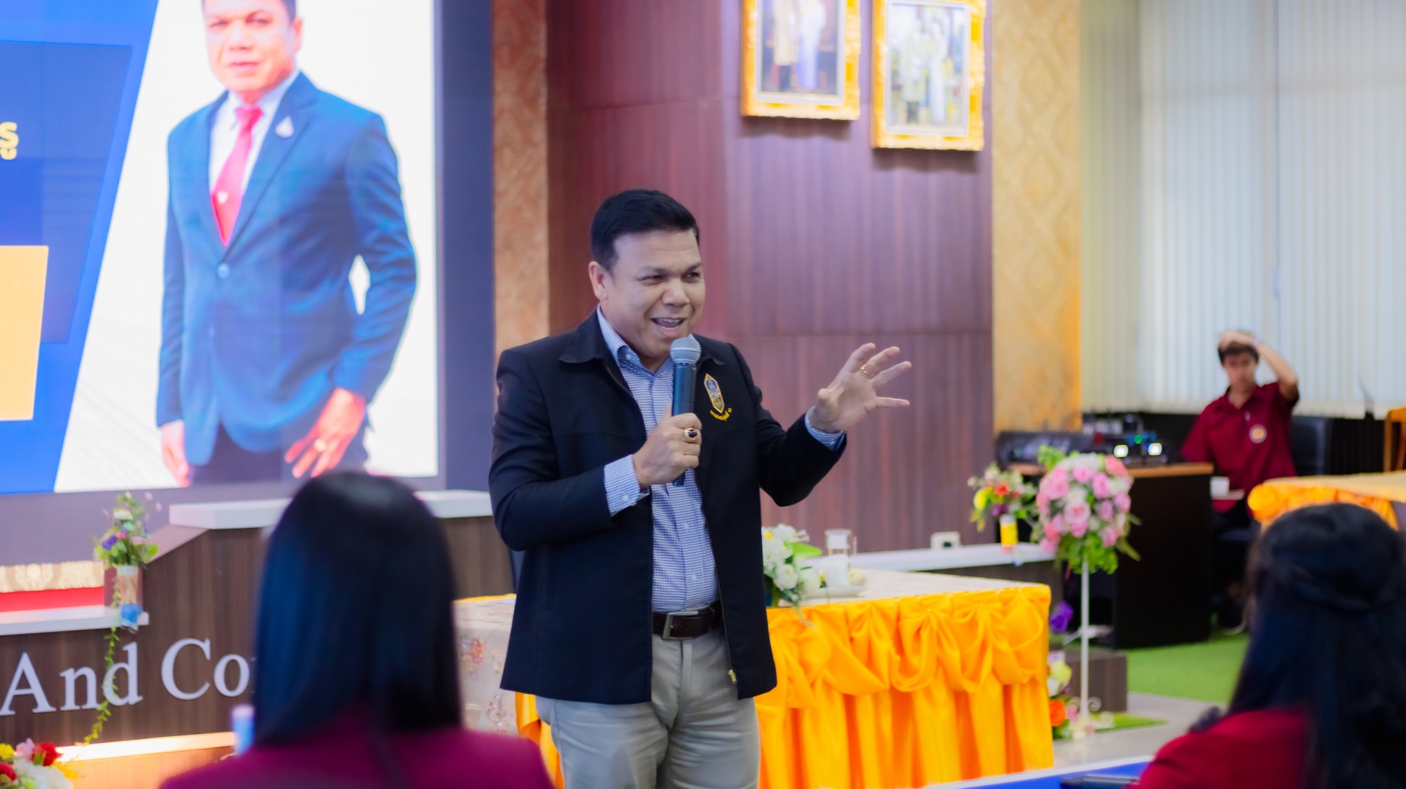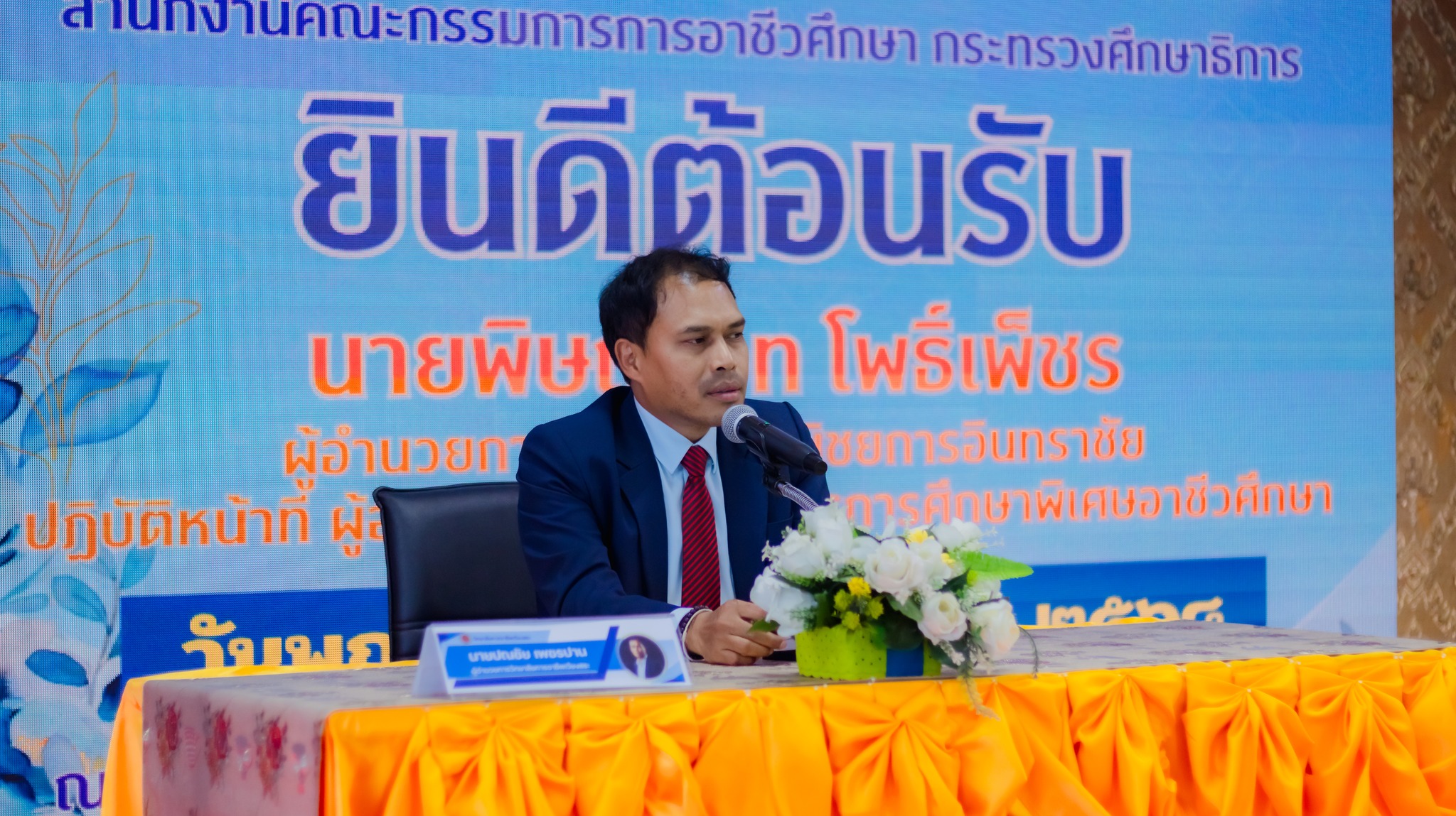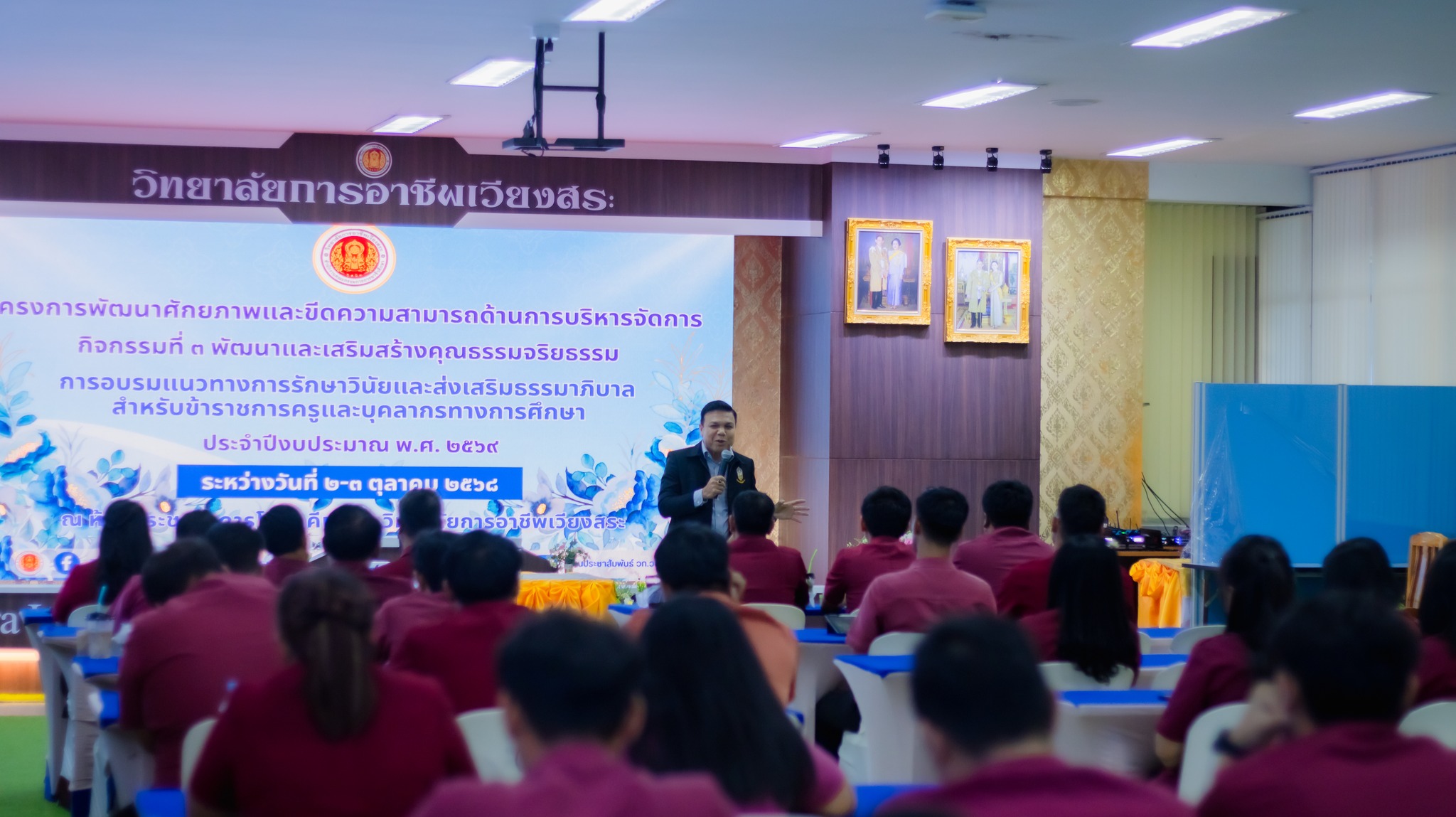 วันพฤหัสบดีที่ 2 ตุลาคม 2568 ผศ.ดร.ปณชัย เพชรปาน ผู้อำนวยการวิทยาลัยการอาชีพเวียงสระ กล่าวตอนรับนายพิษณุเวท โพธิ์เพ็ชร ผู้อำนวยการวิทยาลัยพณิชยการอินทราชัย ปฏิบัติหน้าที่ ผู้อำนวยการศูนย์บริหารการศึกษาพิเศษอาชีวศึกษา ซึ่งให้เกียรติเป็นวิทยากรบรรยายให้ความรู้ ภายใต้โครงการพัฒนาศักยภาพและขีดความสามารถด้านการบริหารจัดการ กิจกรรมที่ 3 พัฒนาและเสริมสร้างคุณธรรมจริยธรรม การอบรมครั้งนี้มุ่งเน้นแนวทางการรักษาวินัยและส่งเสริมธรรมาภิบาล สำหรับข้าราชการครูและบุคลากรทางการศึกษา ประจำปีงบประมาณ พ.ศ. 2569 จัดขึ้นระหว่างวันที่ 2–3 ตุลาคม 2568 ณ ห้องประชุมอาคารโกมลคีมทอง วิทยาลัยการอาชีพเวียงสระ