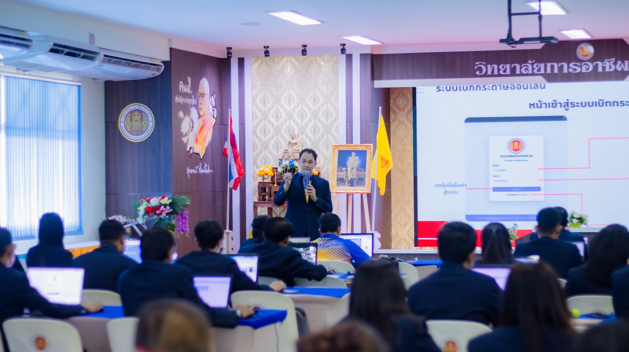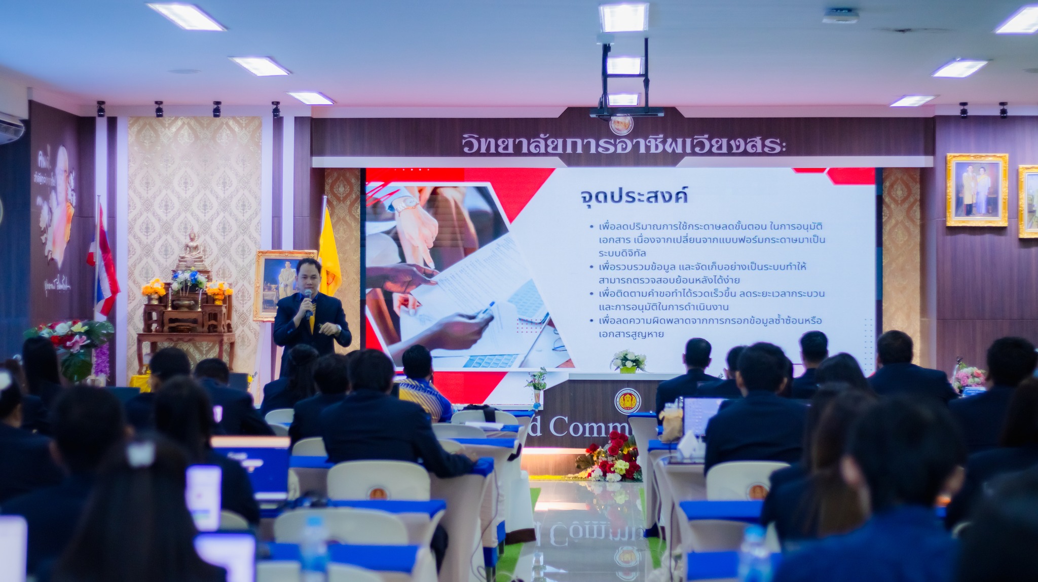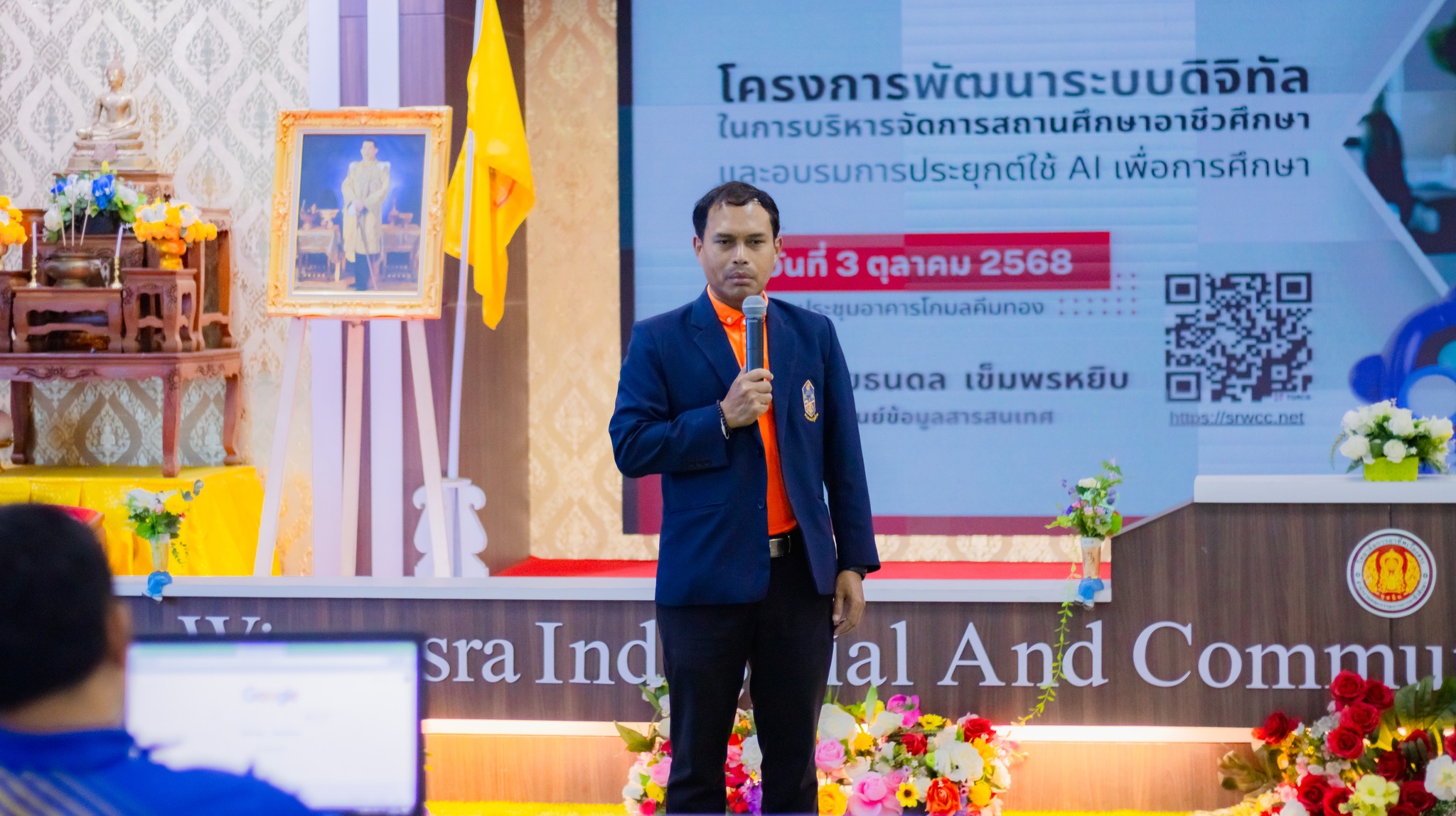 วันศุกร์ที่ 3 ตุลาคม 2568 ผศ.ดร.ปณชัย เพชรปาน ผู้อำนวยการวิทยาลัยการอาชีพเวียงสระ กล่าวเปิดโครงการพัฒนาศักยภาพและขีดความสามารถด้านการบริหารจัดการ สำหรับข้าราชการครูและบุคลากรทางการศึกษา ประจำปีงบประมาณ พ.ศ. 2569 ภายใต้โครงการพัฒนาระบบดิจิทัลในการบริหารจัดการสถานศึกษาอาชีวศึกษา และการอบรมการประยุกต์ใช้ Ai เพื่อการศึกษา โดยได้รับเกียรติจาก นายธนดล เข็มพรหยิบ หัวหน้างานศูนย์ข้อมูลสารสนเทศ เป็นวิทยากรบรรยาย ถ่ายทอดองค์ความรู้ ประสบการณ์ และแนวทางการประยุกต์ใช้ระบบดิจิทัลและเทคโนโลยีปัญญาประดิษฐ์ (Ai) ในการจัดการศึกษา เพื่อเสริมสร้างศักยภาพบุคลากรและยกระดับคุณภาพการเรียนการสอนของสถานศึกษาอาชีวศึกษา