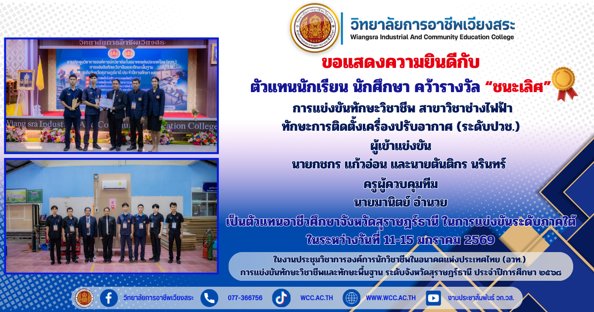 คว้ารางวัล ชนะเลิศ ทักษะการติดตั้งเครื่องปรับอากาศ (ระดับปวช.) การแข่งขันทักษะวิชาชีพและทักษะพื้นฐาน ระดับจังหวัดสุราษฎร์ธานี ประจำปีการศึกษา 2568
