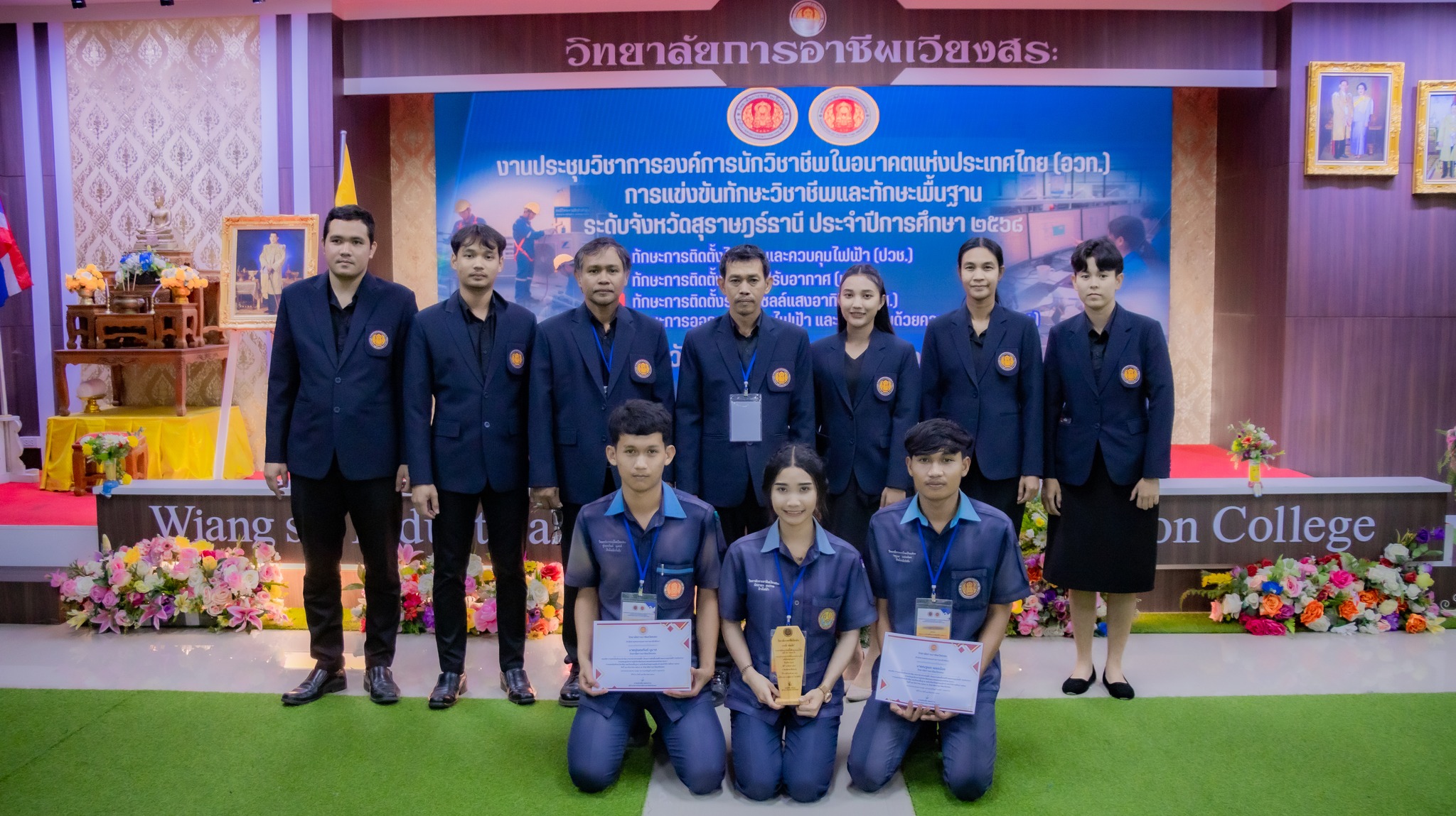 มาแล้ว! รางวัลที่ 1 วิทยาลัยการอาชีพเวียงสระ ขอแสดงความยินดีกับตัวแทนนักเรียน นักศึกษา ที่ได้รับรางวัล ชนะเลิศ การแข่งขันทักษะวิชาชีพ สาขาวิชาช่างไฟฟ้า ทักษะการติดตั้งไฟฟ้าและควบคุมไฟฟ้า (ระดับ ปวช.)