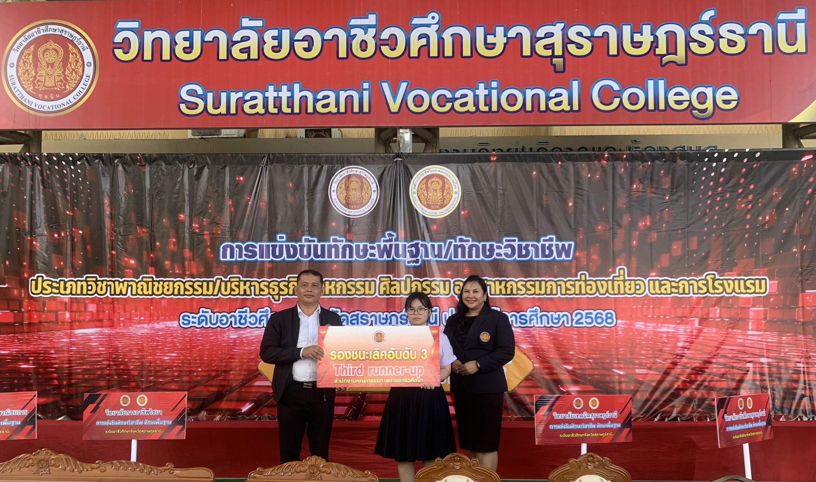 วิทยาลัยการอาชีพเวียงสระ ขอแสดงความยินดีกับตัวแทนนักเรียน นักศึกษา ที่ได้รับรางวัลรองชนะเลิศอันดับ 3 จากการแข่งขันทักษะพื้นฐาน การพูดสาธิตเป็นภาษาอังกฤษ (English Demonstration Contest) ผู้เข้าแข่งขัน ได้แก่ นางสาวบุณณ์ภัสสร พานิช โดยมีนางสาวนิศารัตน์ ทองอ่อน เป็นครูผู้ควบคุมทีม ในงานประชุมวิชาการองค์การนักวิชาชีพในอนาคตแห่งประเทศไทย (อวท.) การแข่งขันทักษะวิชาชีพและทักษะพื้นฐาน ระดับจังหวัดสุราษฎร์ธานี ประจำปีการศึกษา 2568 ทั้งนี้ขอชื่นชมในความมุ่งมั่น ตั้งใจ และความสามารถอันยอดเยี่ยม ที่นำความภาคภูมิใจมาสู่วิทยาลัยและจังหวัดสุราษฎร์ธานี