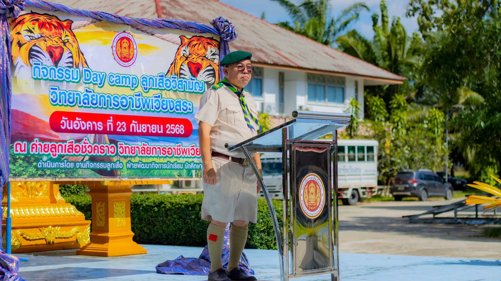 วันอังคารที่ 23 กันยายน 2568 ผศ.ดร.ปณชัย เพชรปาน ผู้อำนวยการวิทยาลัยการอาชีพเวียงสระ มอบหมายให้ นายจักรินทร์ โกละกะ รองผู้อำนวยการฝ่ายพัฒนากิจการนักเรียน นักศึกษา เป็นประธานในพิธีเปิดโครงการ Day Camp ลูกเสือวิสามัญ ประจำปีการศึกษา 2568 ซึ่งเป็นกิจกรรมตามรายวิชาลูกเสือวิสามัญ 1 โดยจัดรูปแบบเข้าค่ายกลางวัน (Day Camp) อันเป็นกิจกรรมบังคับตามหลักสูตร เพื่อส่งเสริมให้นักเรียน นักศึกษา ได้รับประสบการณ์ตรงในการพัฒนาทางด้านสังคม อารมณ์ และสติปัญญา อีกทั้งยังเป็นการฝึกฝนตนเองด้านระเบียบวินัย ความอดทน ความเสียสละ และความสามัคคีในหมู่คณะ