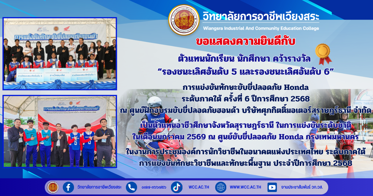 คว้ารางวัลรองชนะเลิศอันดับ 5 และรองชนะเลิศอันดับ 6” ประเภทนักเรียนหญิง ในการแข่งขันทักษะขับขี่ปลอดภัย Honda ระดับภาคใต้ ครั้งที่ 6 ปีการศึกษา 2568