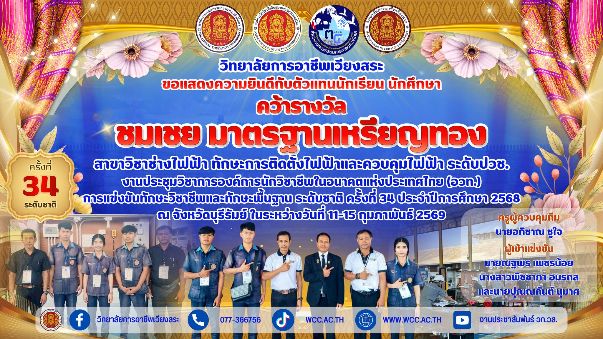 คว้ารางวัล ชนะเลิศ ทักษะการติดตั้งไฟฟ้าและควบคุมไฟฟ้า (ระดับ ปวช.) การแข่งขันทักษะวิชาชีพและทักษะพื้นฐาน ระดับจังหวัดสุราษฎร์ธานี ประจำปีการศึกษา 2568