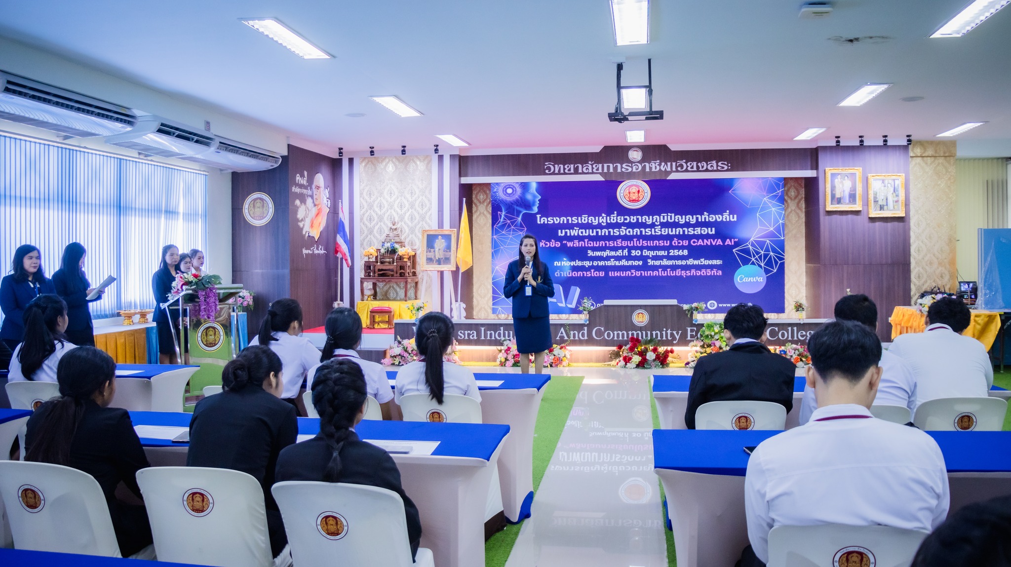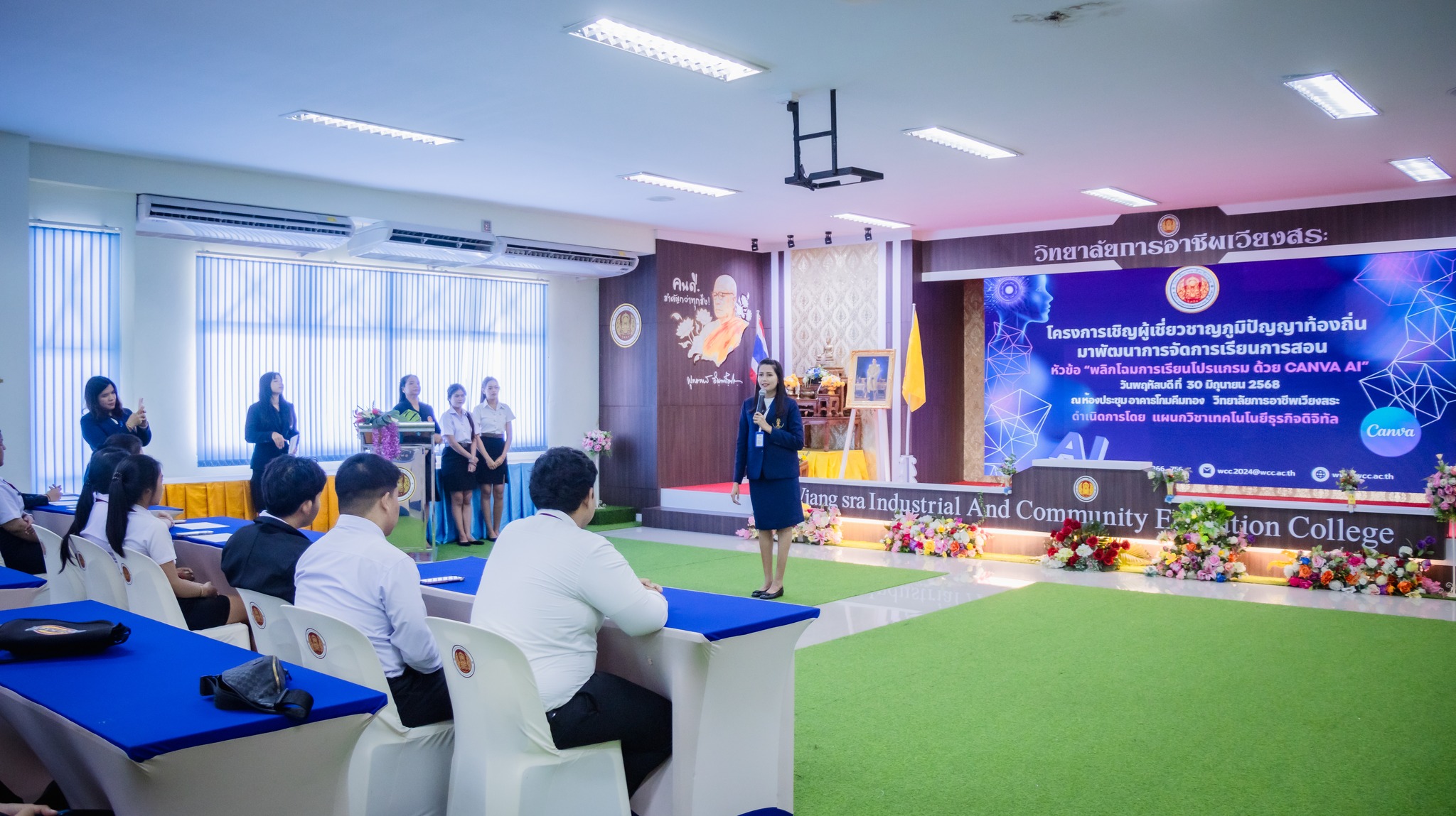 โครงการเชิญผู้เชี่ยวชาญภูมิปัญญาท้องถิ่นมาพัฒนาการจัดการเรียนการสอน หัวข้อ “พลิกโฉมการเรียนโปรแกรม ด้วย CANVA AI” จัดขึ้นเพื่อพัฒนาศักยภาพครูและนักศึกษาในการใช้เทคโนโลยีดิจิทัลและปัญญาประดิษฐ์ (AI) ในการออกแบบและสร้างสื่อการเรียนการสอนอย่างสร้างสรรค์ ส่งเสริมการเรียนรู้ให้ทันต่อการเปลี่ยนแปลงของเทคโนโลยีในยุคดิจิทัล และเปิดโอกาสให้นักศึกษาได้เรียนรู้จากผู้เชี่ยวชาญภูมิปัญญาท้องถิ่นเพื่อนำความรู้ไปประยุกต์ใช้ในการเรียนและการประกอบอาชีพในอนาคต
