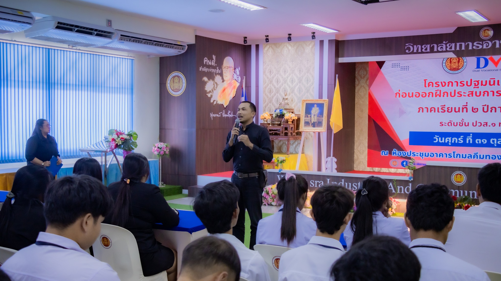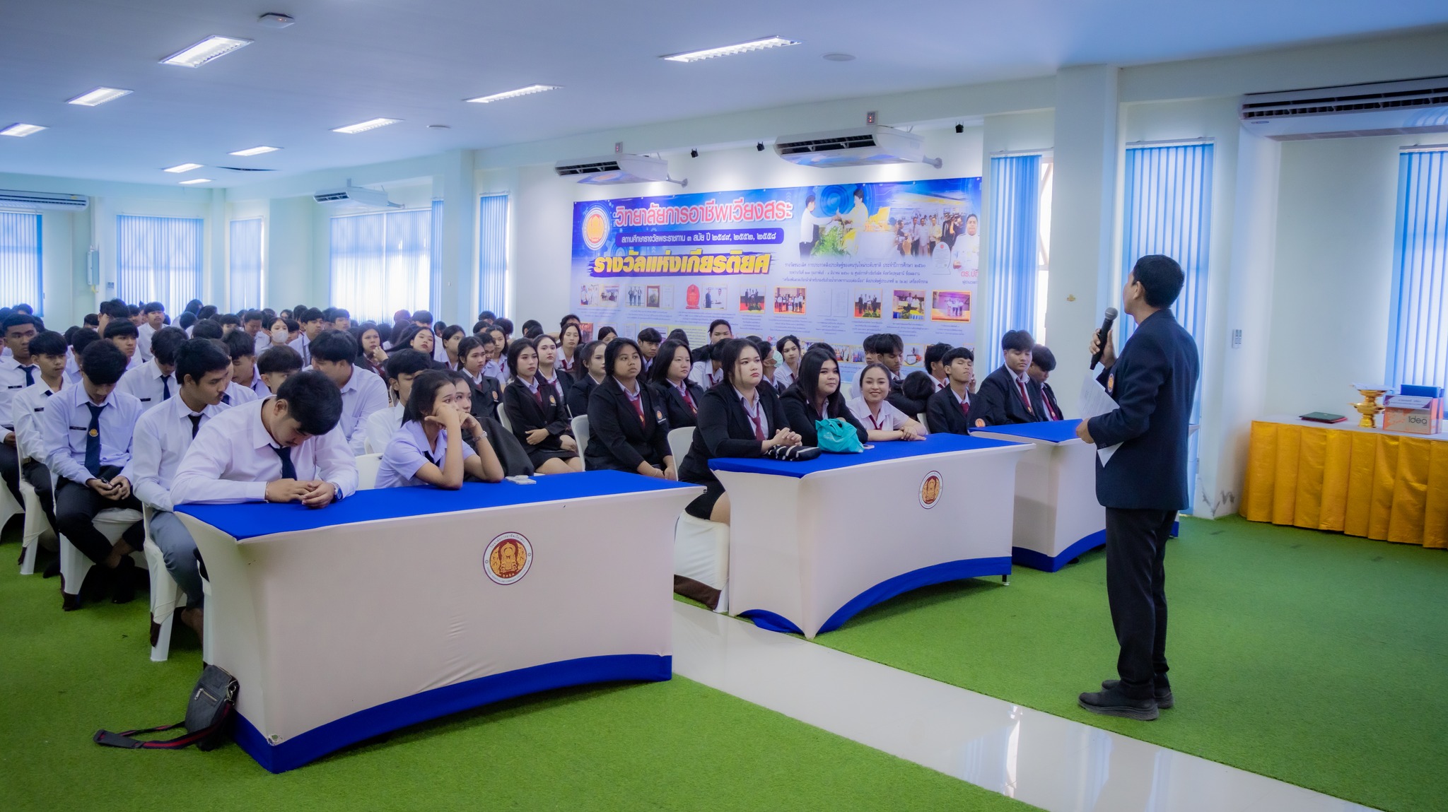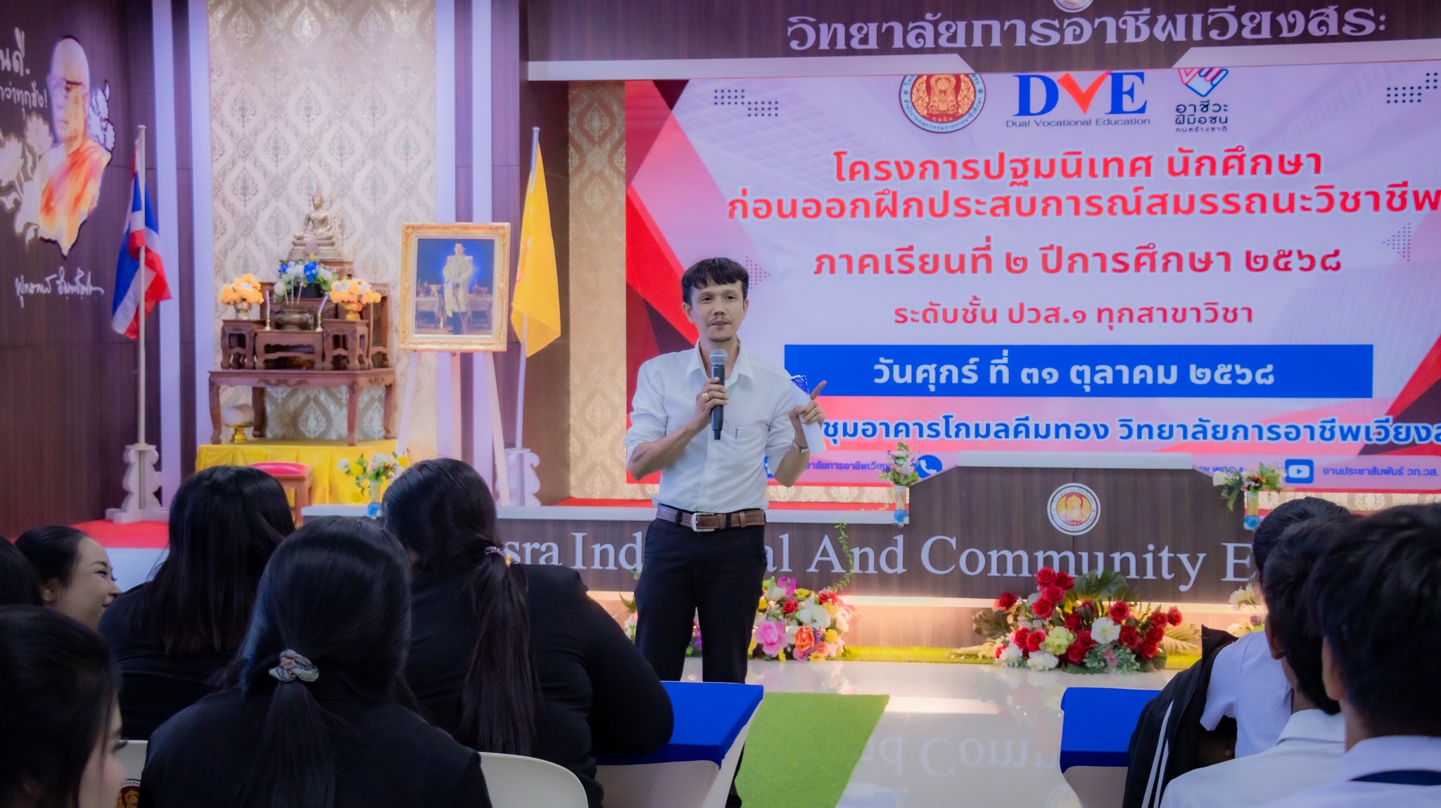 วันศุกร์ที่ 31 ตุลาคม 2568 นายมนตรี ปรีชา รองผู้อำนวยการฝ่ายบริหารทรัพยากรและฝ่ายวิชาการ เป็นประธานกล่าวเปิดโครงการปฐมนิเทศนักเรียน นักศึกษา ก่อนออกฝึกประสบการณ์สมรรถนะวิชาชีพ ภาคเรียนที่ 2 ปีการศึกษา 2568 โดยมีนายศุภชัย สมนิล หัวหน้างานอาชีวศึกษาระบบทวิภาคี ผู้รับผิดชอบโครงการการบริหารงานอาชีวศึกษาระบบทวิภาคี พร้อมด้วย คณะครู บุคลากรทางการศึกษา ตลอดจนนักศึกษาระดับประกาศนียบัตรวิชาชีพชั้นสูง ปวส.1 ทุกสาขาวิชา เข้าร่วมกิจกรรมอย่างพร้อมเพรียง ณ ห้องประชุมอาคารโกมลคีมทอง วิทยาลัยการอาชีพเวียงสระ