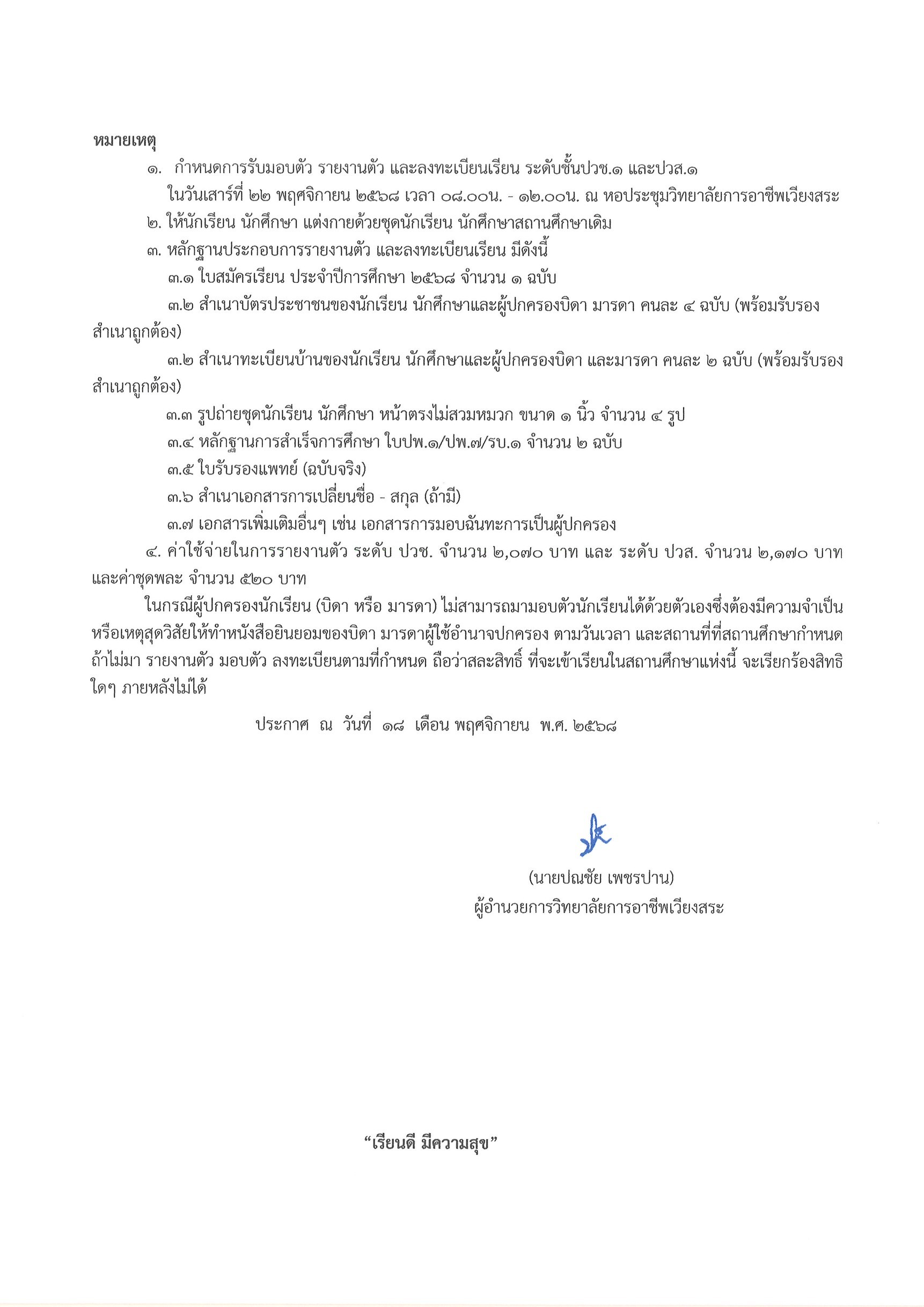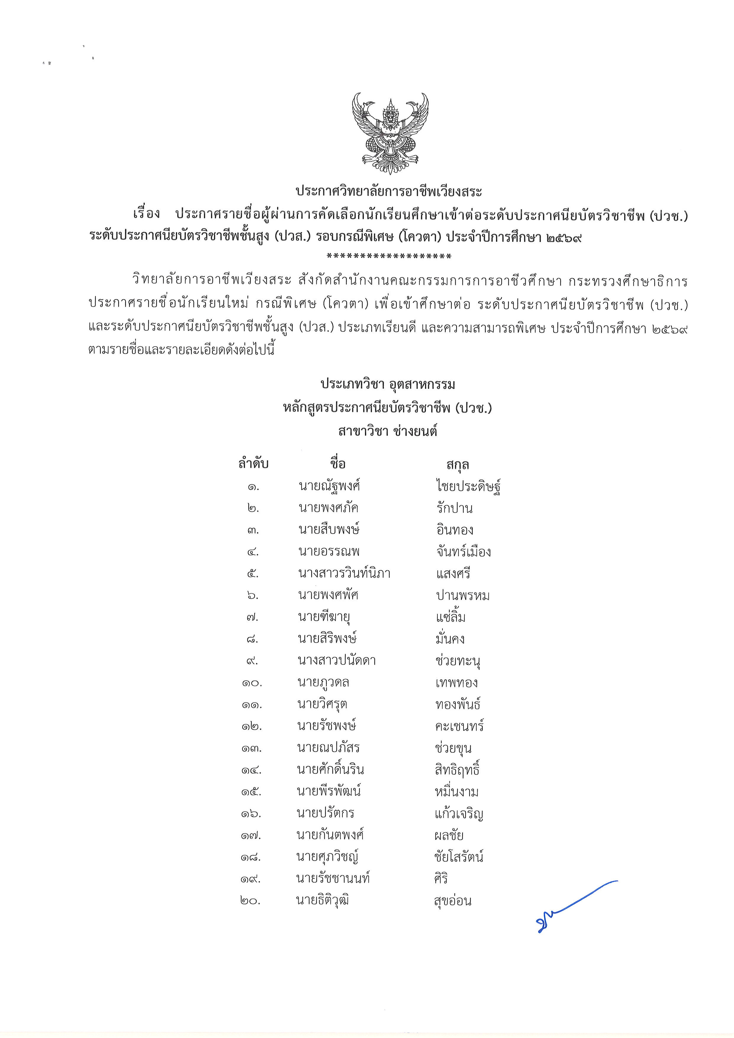 วิทยาลัยการอาชีพเวียงสระ ประกาศรายชื่อผู้ผ่านการคัดเลือกเข้าศึกษาต่อ