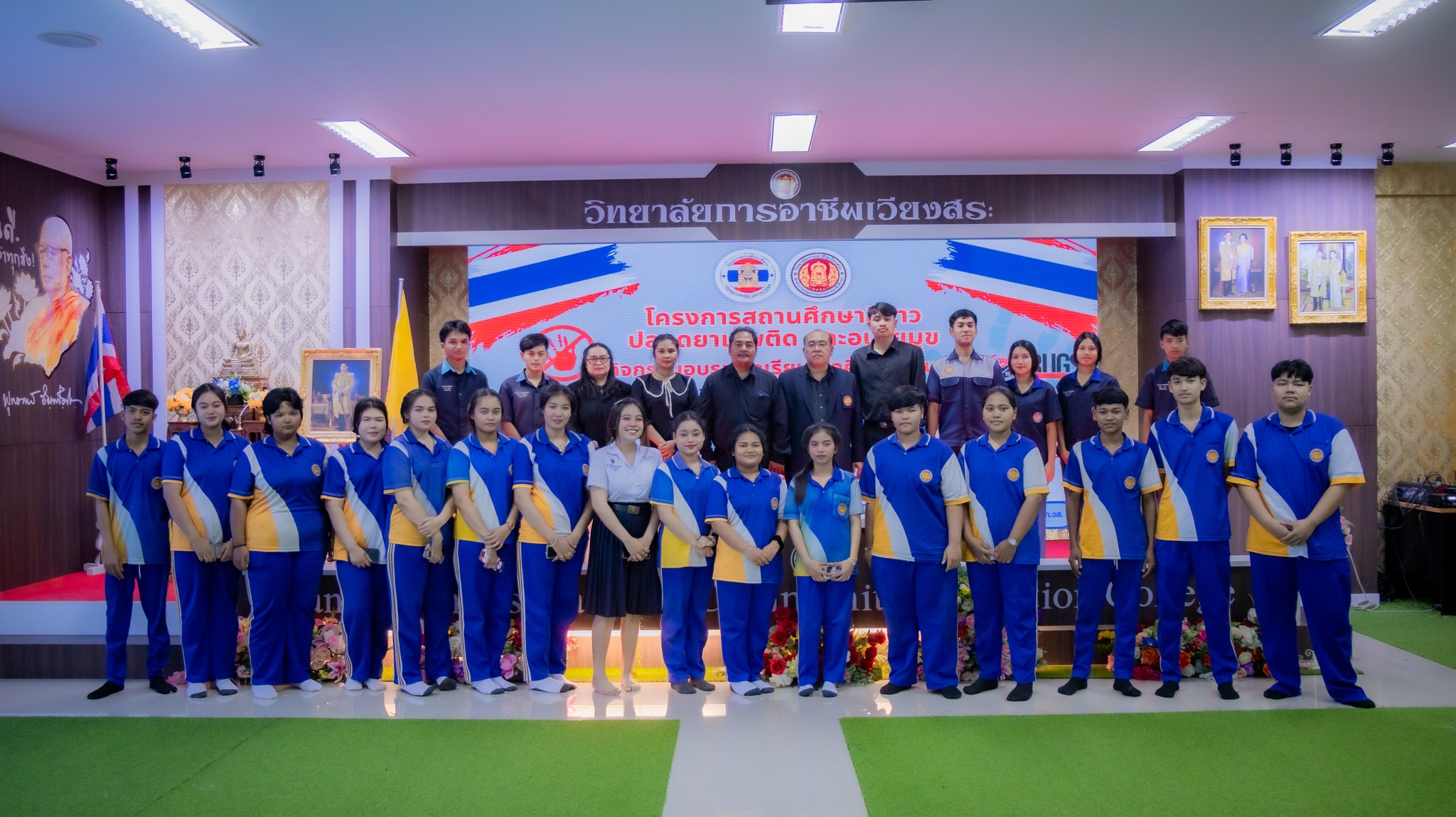 ในการนี้ คณะผู้บริหาร ครู บุคลากรทางการศึกษา และนักเรียน นักศึกษา วิทยาลัยการอาชีพเวียงสระ ได้เข้าร่วมกิจกรรมดังกล่าวอย่างพร้อมเพรียง เพื่อร่วมเสริมสร้างความรู้ ความตระหนัก และทัศนคติที่ถูกต้องในการป้องกันปัญหายาเสพติด ตลอดจนสนับสนุนการพัฒนาแกนนำเยาวชนให้มีบทบาทในการสร้างสภาพแวดล้อมที่ปลอดภัยภายในสถานศึกษา ณ หอประชุมอาคารโกมลคีมทอง วิทยาลัยการอาชีพเวียงสระ