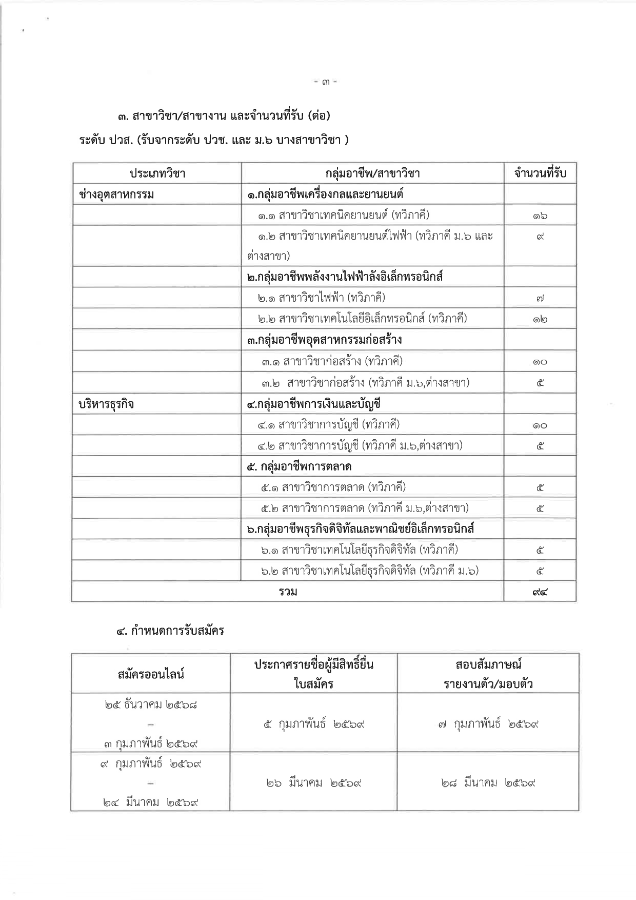 วิทยาลัยการอาชีพเวียงสระ เปิดรับสมัครนักเรียน นักศึกษาใหม่ ประจำปีการศึกษา 2569 ระดับประกาศนียบัตรวิชาชีพ (ปวช.) สำหรับผู้สำเร็จการศึกษาระดับมัธยมศึกษาตอนต้น (ม.3) และระดับประกาศนียบัตรวิชาชีพชั้นสูง (ปวส.) สำหรับผู้สำเร็จการศึกษาระดับ ปวช. ประเภทการรับสมัครรอบทั่วไป โดยรอบที่ 1 เปิดรับสมัครระหว่างวันที่ 25 ธันวาคม 2568 – 3 กุมภาพันธ์ 2569 และรอบที่ 2 ระหว่างวันที่ 9 กุมภาพันธ์ – 24 มีนาคม 2569 ประกาศผลการคัดเลือกวันที่ 5 กุมภาพันธ์ 2569 (รอบที่ 1) และวันที่ 26 มีนาคม 2569 (รอบที่ 2) ผู้ผ่านการคัดเลือกต้องเข้าสอบสัมภาษณ์ รายงานตัว และยืนยันสิทธิ์ในวันที่ 7 กุมภาพันธ์ 2569 (รอบที่ 1) และวันที่ 28 มีนาคม 2569 (รอบที่ 2) สมัครได้ทางออนไลน์ที่ https://admission.vec.go.th/web/student.htm?mode=init หรือสมัครด้วยตนเอง ณ วิทยาลัยการอาชีพเวียงสระ ในวันและเวลาราชการ ดูรายละเอียดเพิ่มเติมได้ที่ https://www.wcc.ac.th/ และ Facebook : วิทยาลัยการอาชีพเวียงสระ