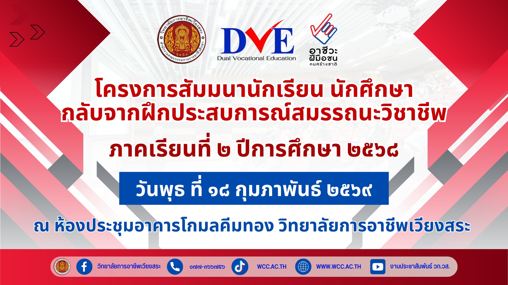 วันพุธ ที่ 18 กุมภาพันธ์ 2569 ดร.ปณชัย เพชรปาน ผู้อำนวยการวิทยาลัยการอาชีพเวียงสระ เป็นประธานกล่าวเปิด “โครงการสัมมนานักเรียน นักศึกษา กลับจาก ฝึกประสบการณ์สมรรถนะวิชาชีพ” ภาคเรียนที่ 2 ปีการศึกษา 2568 โดยมี นายศุภชัย สมนิล หัวหน้างานอาชีวศึกษาระบบทวิภาคี ผู้รับผิดชอบโครงการ กล่าวรายงานฯ พร้อมด้วย ครู บุคลากรทางการศึกษา ตลอดจนนักเรียนระดับประกาศนียบัตรวิชาชีพ ปวช.2 สาขาวิชาช่างยนต์ (ทวิภาคี) และนักศึกษาระดับประกาศนียบัตรวิชาชีพชั้นสูง ปวส.1 ทุกสาขาวิชา เข้าร่วมกิจกรรมอย่างพร้อมเพรียง ณ ห้องประชุมอาคารโกมลคีมทอง วิทยาลัยการอาชีพเวียงสระ