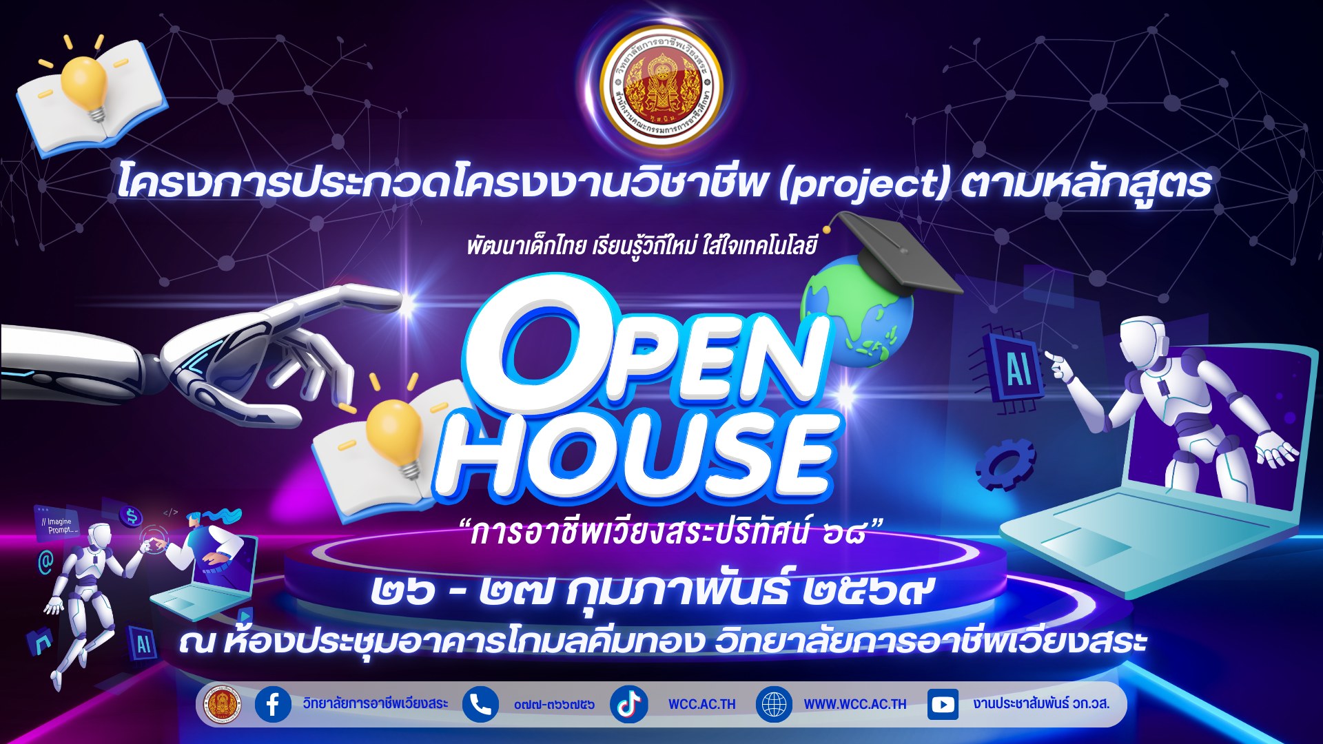 โครงการประกวดโครงงานวิชาชีพ (Project) ตามหลักสูตร “การอาชีพเวียงสระปริทัศน์ (Open House 68)” ประจำปีการศึกษา 2568 เพื่อส่งเสริมให้นักเรียนและนักศึกษาได้แสดงศักยภาพและผลงานทางวิชาชีพตามสาขาที่เรียน พัฒนาทักษะกระบวนการคิด วิเคราะห์ และการแก้ปัญหาอย่างเป็นระบบ บูรณาการความรู้ภาคทฤษฎีสู่การปฏิบัติจริง เสริมสร้างประสบการณ์การนำเสนอผลงานต่อสาธารณชน ตลอดจนสร้างความภาคภูมิใจในความสำเร็จของผู้เรียน และประชาสัมพันธ์ศักยภาพการจัดการเรียนการสอนของ วิทยาลัยการอาชีพเวียงสระ สู่ชุมชนและเครือข่ายความร่วมมืออย่างกว้างขวาง