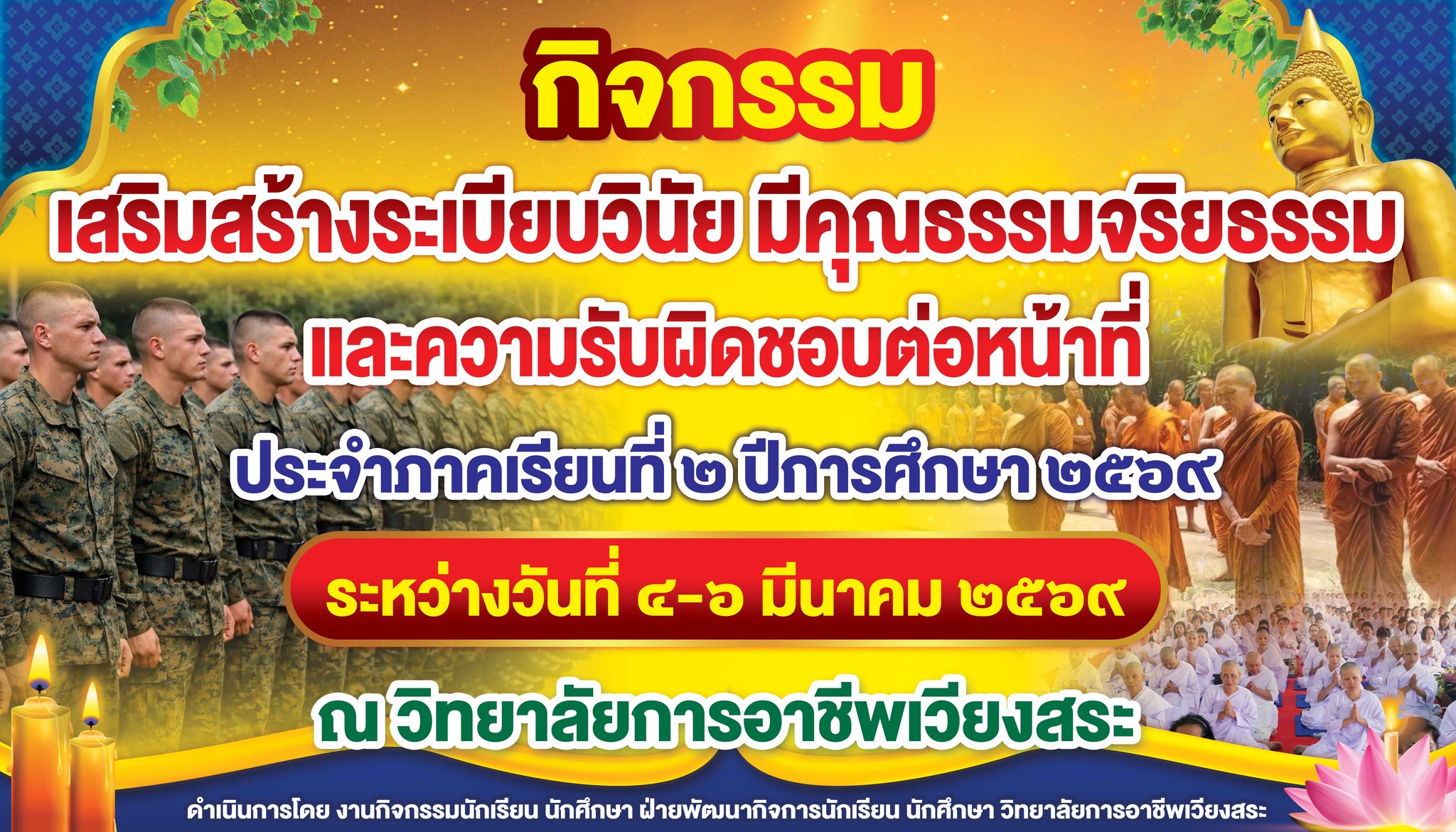 กิจกรรมเสริมสร้างระเบียบวินัย มีคุณธรรมจริยธรรม และความรับผิดชอบต่อหน้าที่ ภาคเรียนที่ 2 ประจำปีการศึกษา 2568 จัดขึ้นในระหว่างวันที่ 4-6 มีนาคม 2569 โดยมุ่งเน้นปลูกฝังให้นักเรียน นักศึกษา มีวินัย คุณธรรม จริยธรรม และความรับผิดชอบต่อหน้าที่ ผ่านการเรียนรู้และฝึกปฏิบัติจริง ทั้งกิจกรรมกลุ่ม กิจกรรมนันทนาการ และกิจกรรมเชิงปฏิบัติการ เพื่อพัฒนาทักษะการทำงานร่วมกับผู้อื่น ส่งเสริมความคิดสร้างสรรค์ และเสริมสร้างการตัดสินใจอย่างมีประสิทธิภาพ อันเป็นพื้นฐานสำคัญในการเตรียมความพร้อมสู่การเป็นกำลังคนคุณภาพในอนาคต