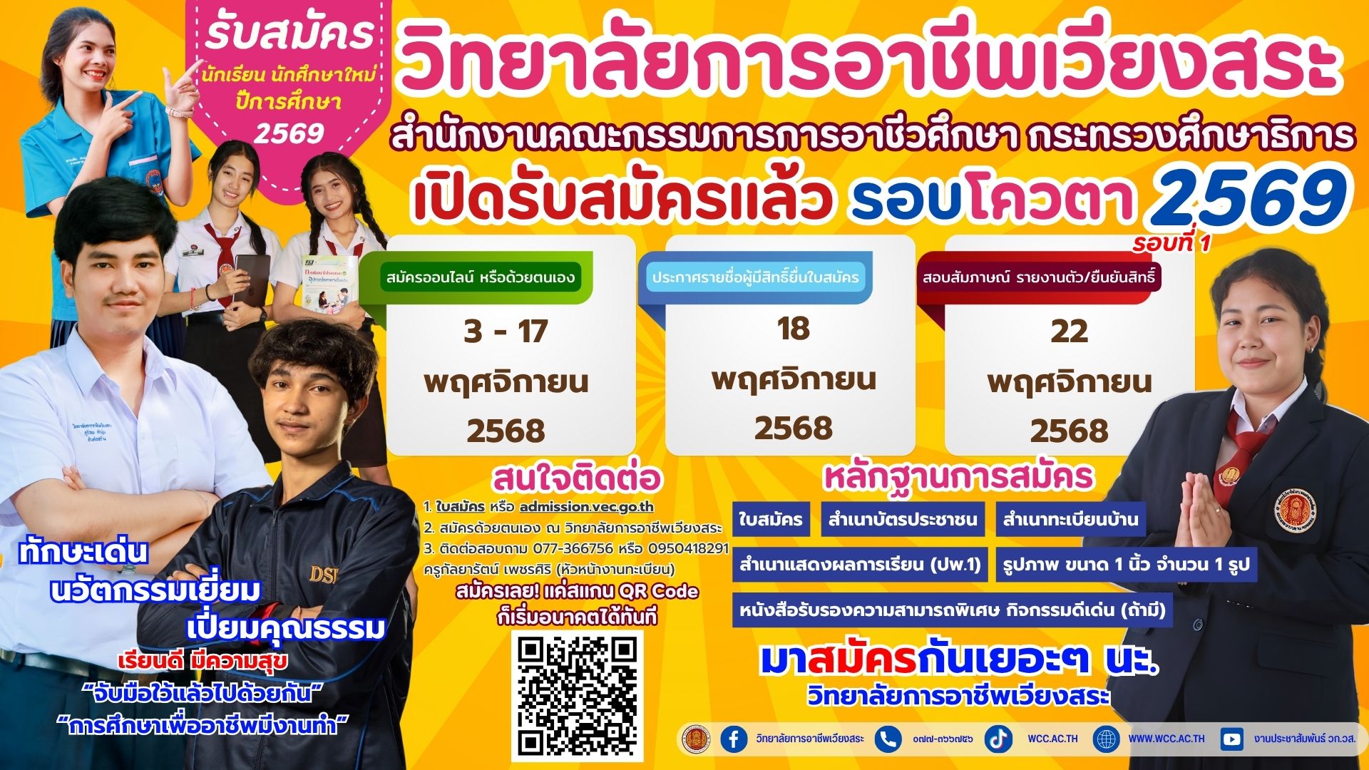 การรับสมัครนักเรียนระดับชั้นมัธยมศึกษาตอนต้น (ม.3) เข้าศึกษาต่อระดับประกาศนียบัตรวิชาชีพ (ปวช.) และระดับประกาศนียบัตรวิชาชีพ (ปวช.) เข้าศึกษาต่อระดับประกาศนียบัตรวิชาชีพชั้นสูง (ปวส.) ประจำปีการศึกษา 2569