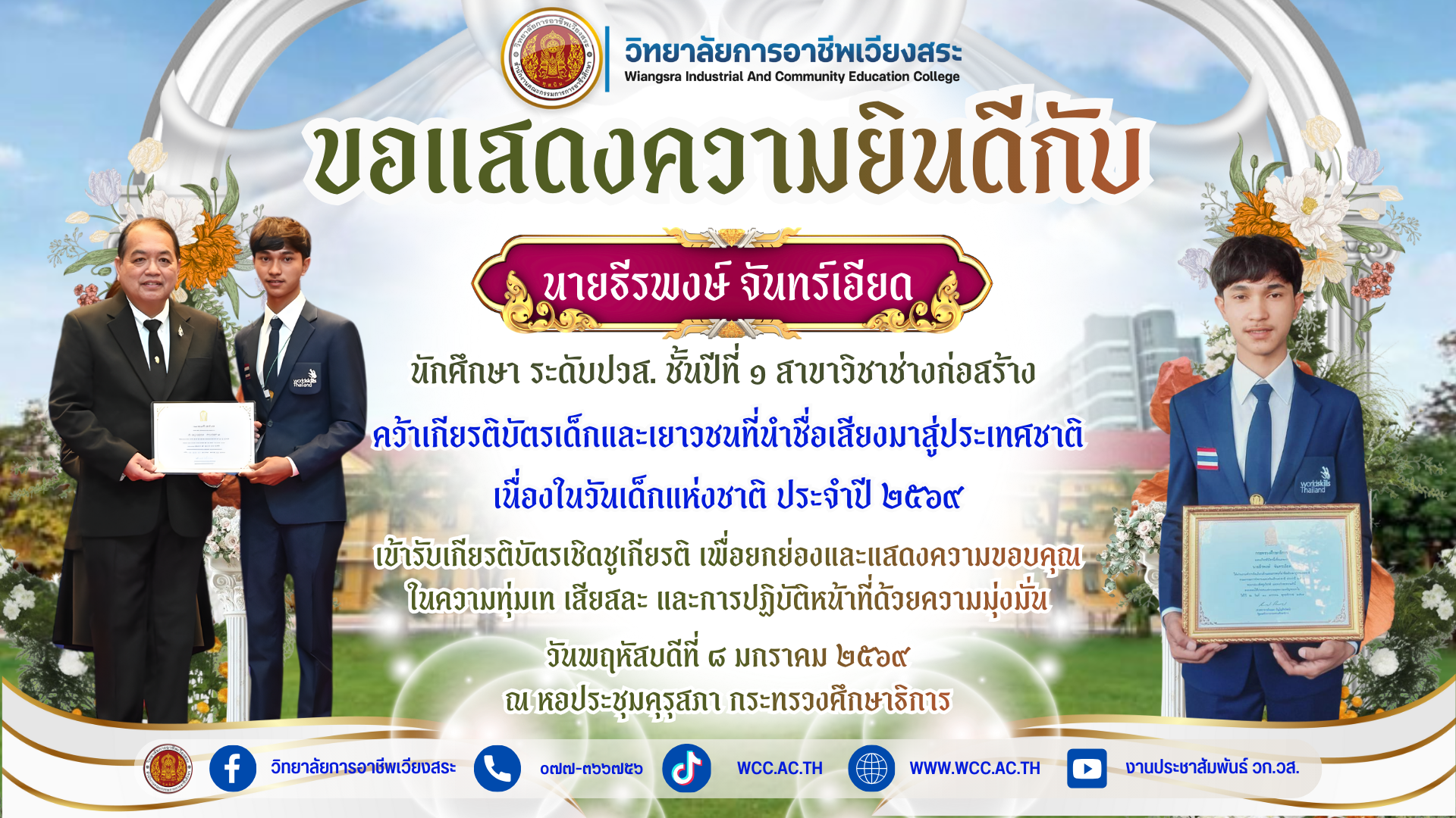 ขอแสดงความยินดีกับ นายธีรพงษ์ จันทร์เอียด คว้าเกียรติบัตรเด็กและเยาวชนที่นำชื่อเสียงมาสู่ประเทศชาติ เนื่องในวันเด็กแห่งชาติ ประจำปี ๒๕๖๙