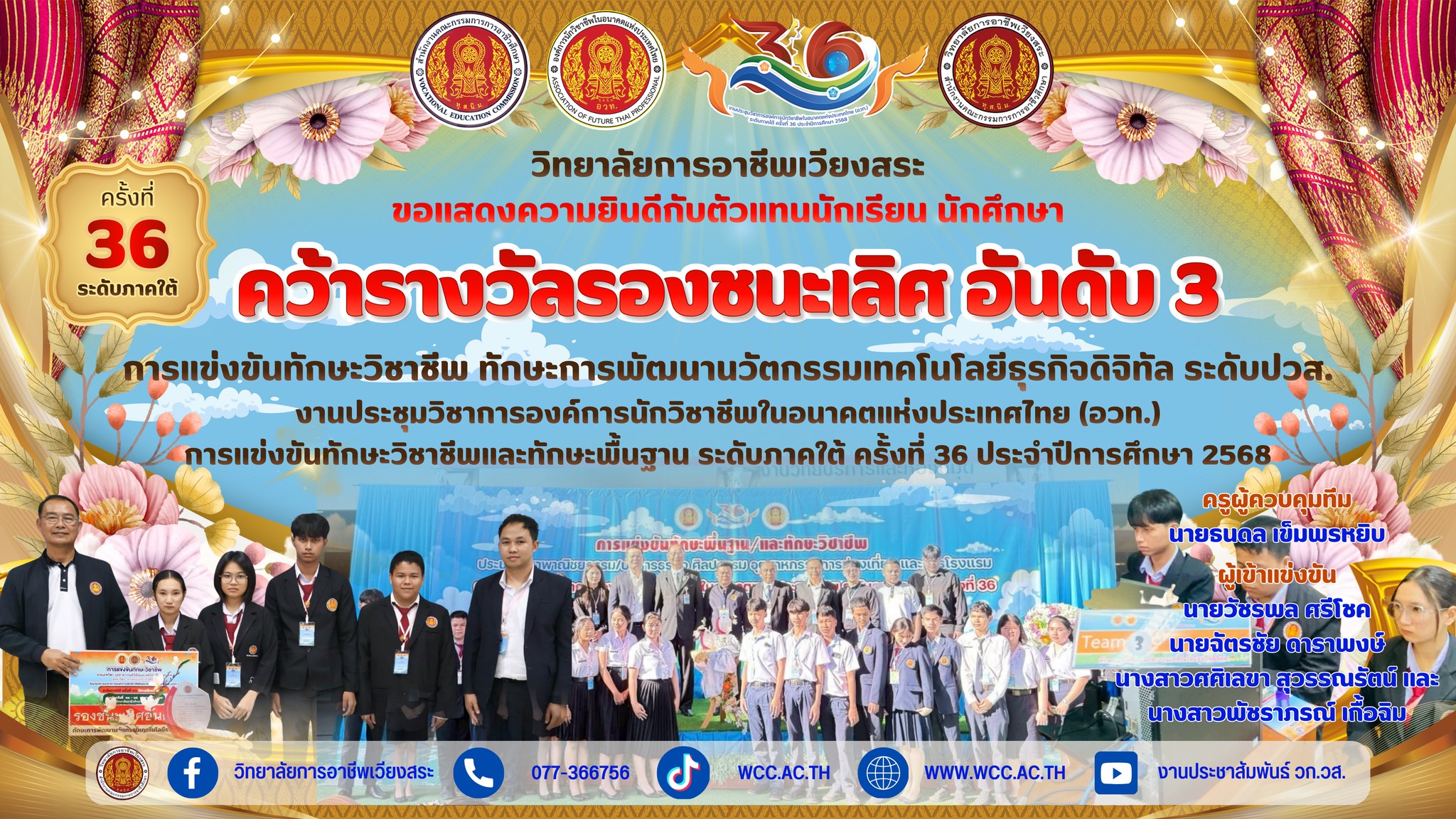 คว้ารางวัลรองชนะเลิศ อันดับ 3 ทักษะการพัฒนานวัตกรรมเทคโนโลยีธุรกิจดิจิทัล ระดับปวส. ระดับภาคใต้ ครั้งที่ 36